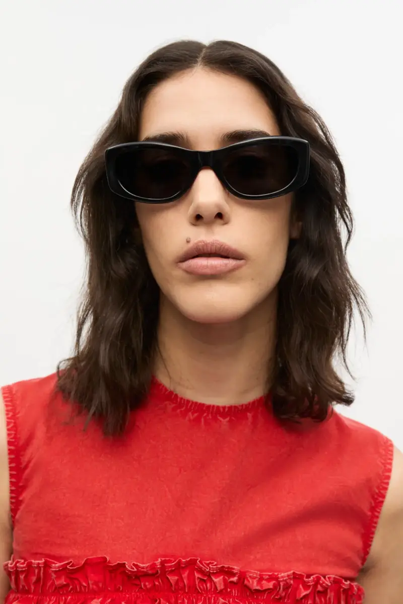 GANNI x Ace & Tate keert terug met drie limited edition zonnebrilmodellen die zijn ontworpen om elke kant van uw persoonlijkheid te accentueren. Deze zonnebril heeft een zwart rechthoekig montuur. De t