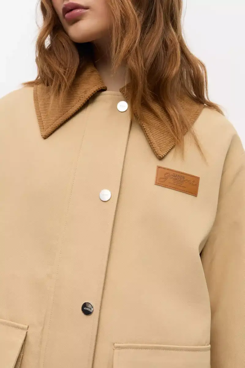 Dit jasje heeft een contrasterende kraag en grote zakken aan de voorkant.