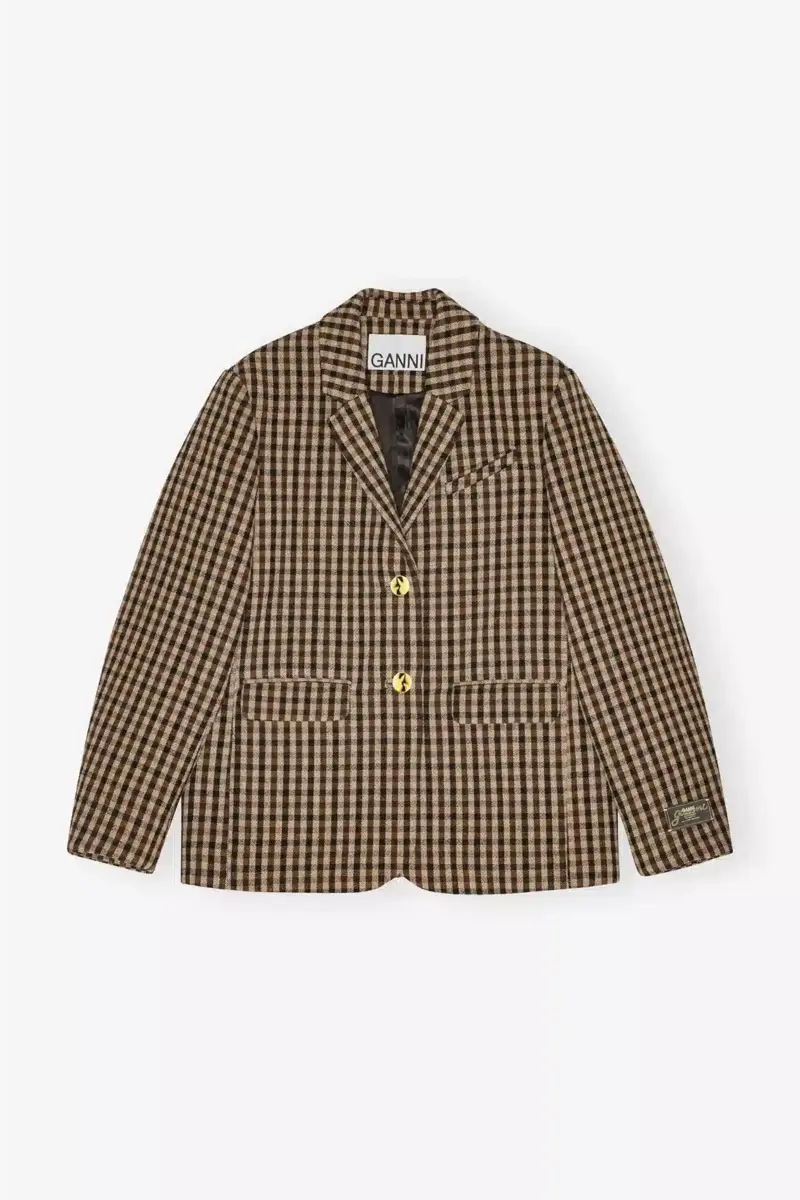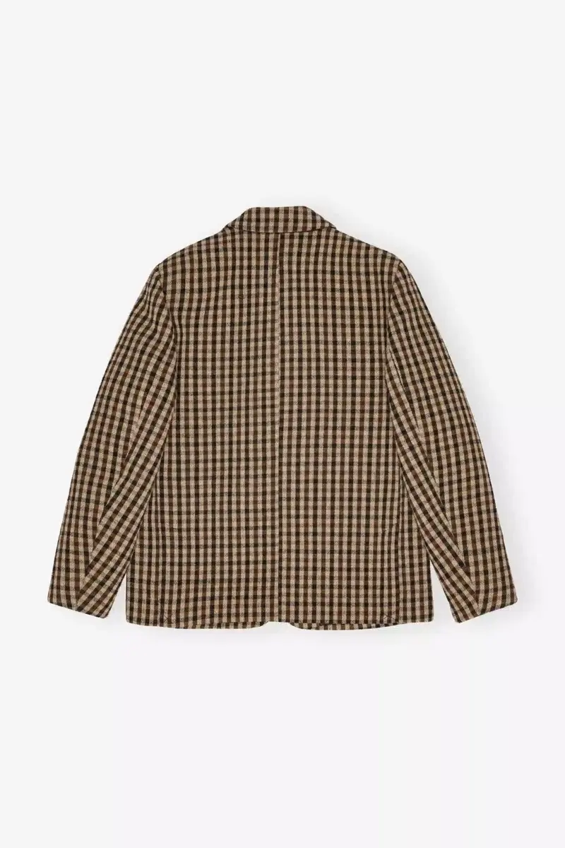 Deze blazer heeft een geruit patroon, een kraag, revers en een sluiting met twee knopen aan de voorkant. De blazer heeft een GANNI-logo op de mouw.