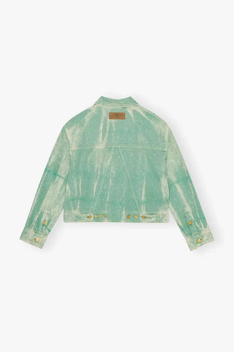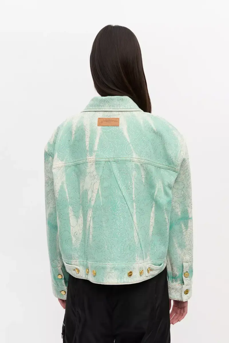 Dit spijkerjasje heeft een groene wassing met strass-details, een klassieke kraag, een knoopsluiting aan de voorkant en twee borstzakken.