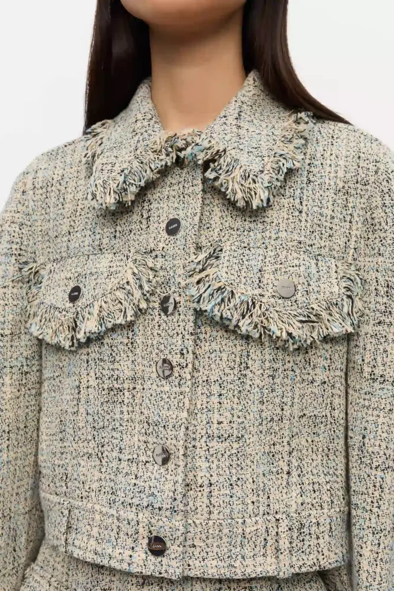 Dit jasje heeft een cropped silhouet met een knoopsluiting aan de voorkant. Het ontwerp is voorzien van een klassieke kraag, borstzakken en franjes.