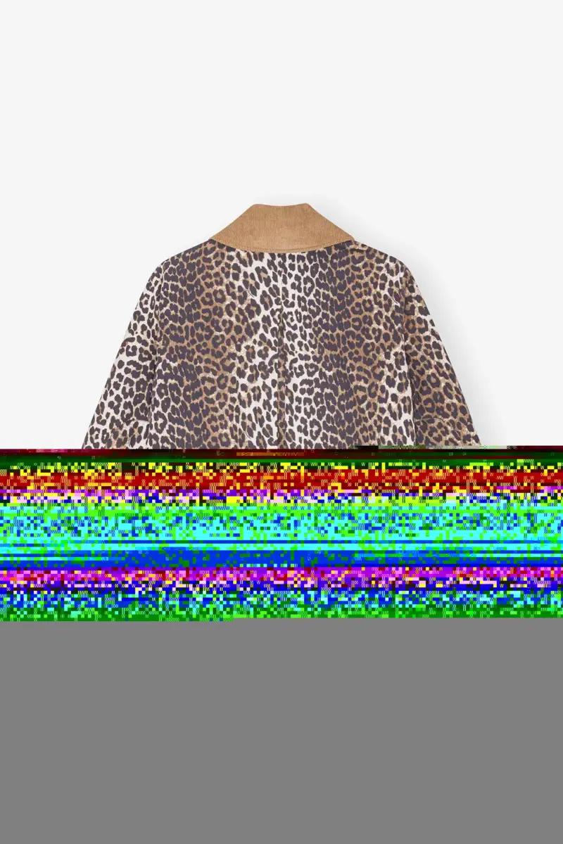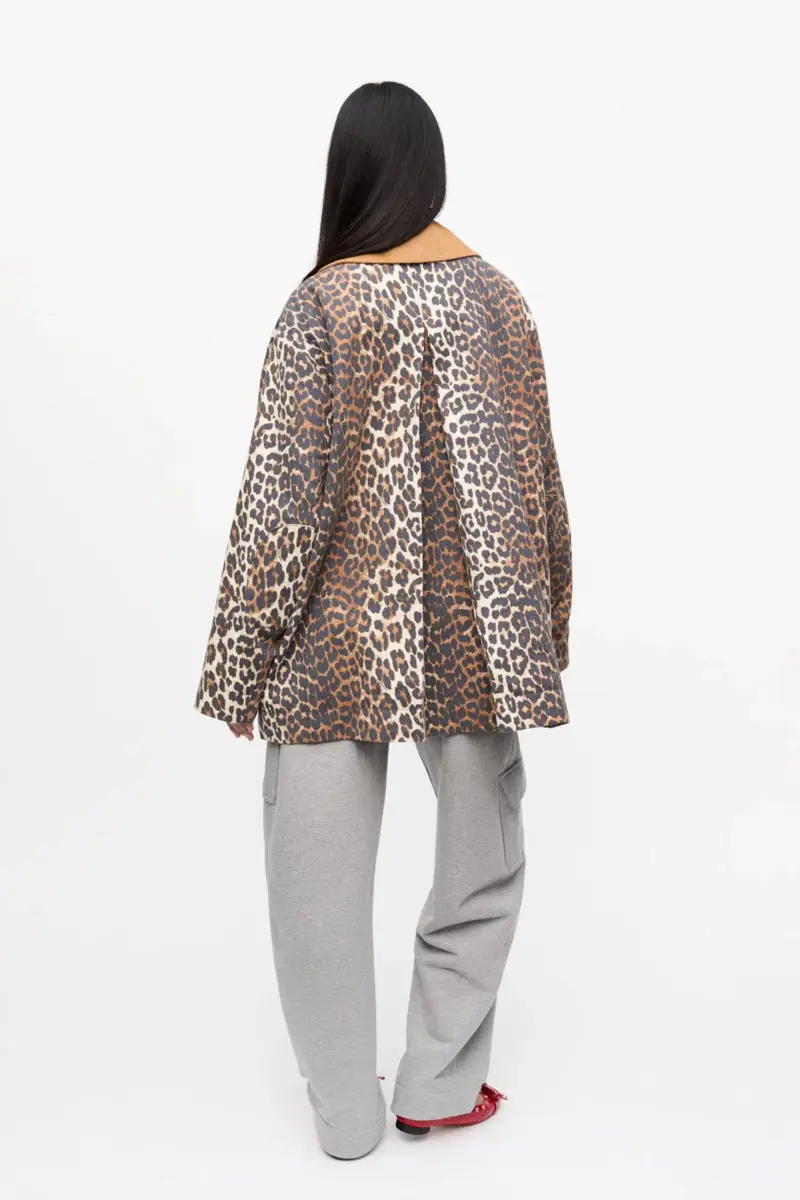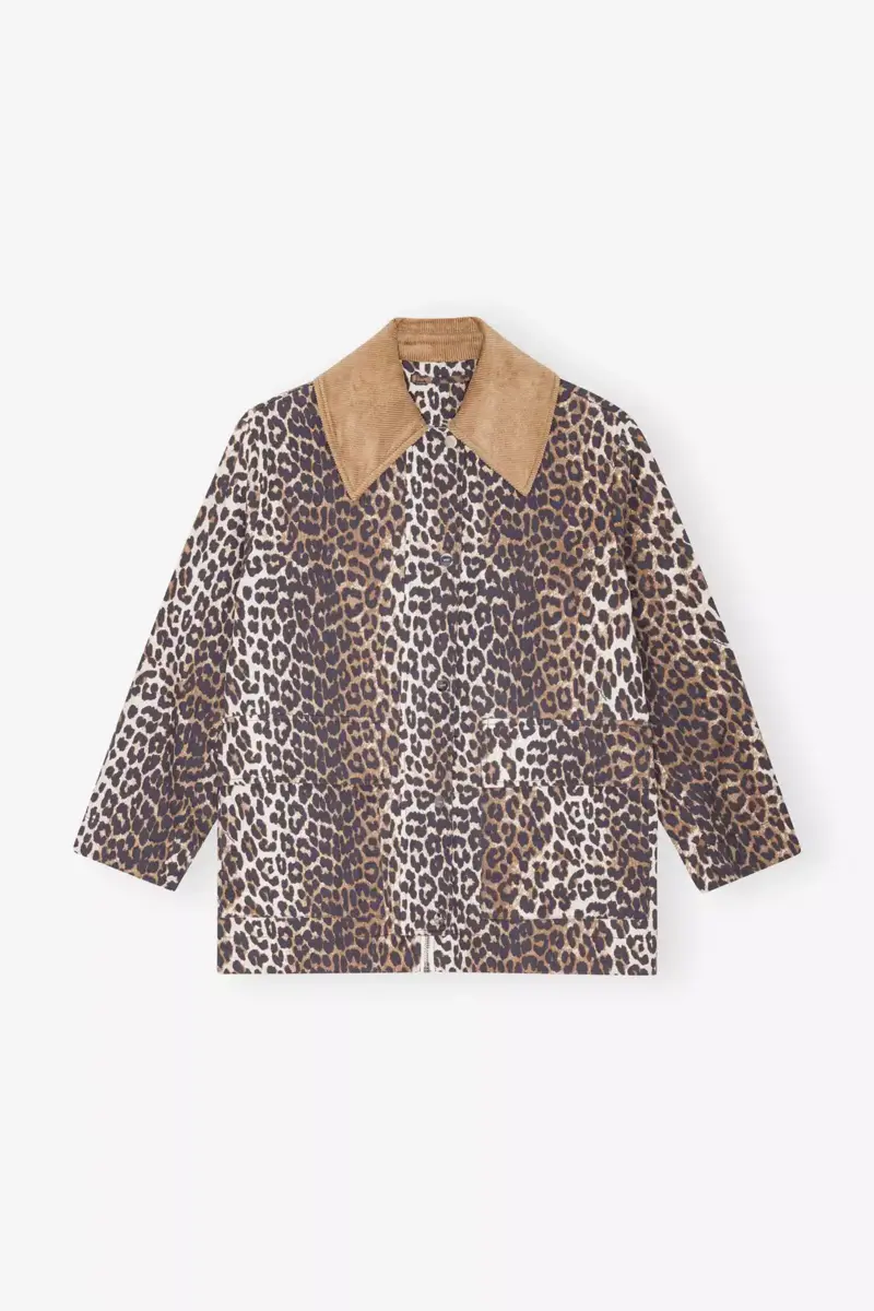 Dit midi-jasje van canvas met luipaardprint is ontworpen voor een relaxte, boxy pasvorm en heeft een brede corduroy kraag in een contrasterende camelkleur. Het jasje heeft een knoopsluiting aan de voorkant.