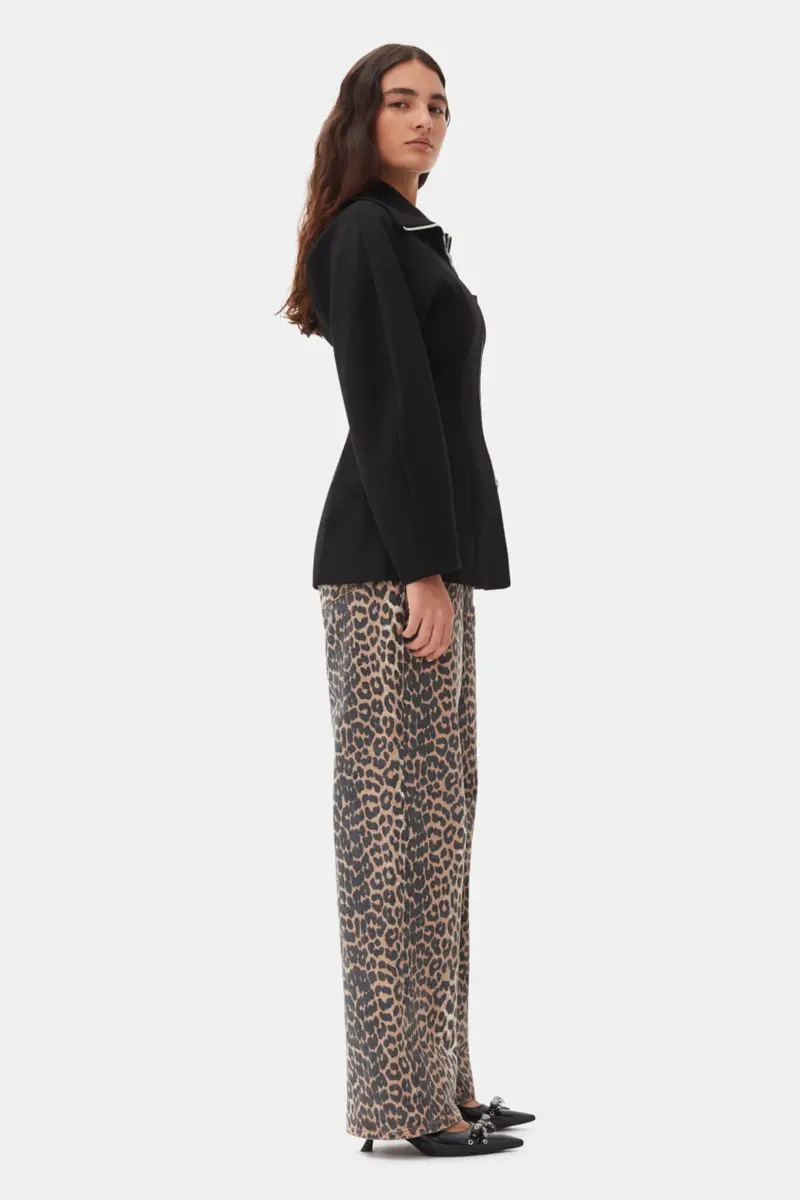 Dit zwarte jasje van gebonden crêpe met gebogen mouwen heeft een ritssluiting aan de voorkant met een zilveren ritssluiting, een hoge kraag die omhoog of omlaag kan worden gedragen en een steekzak op de borst.