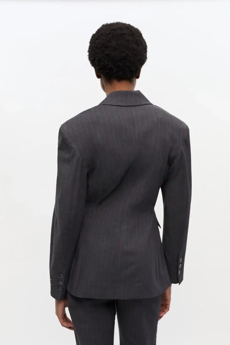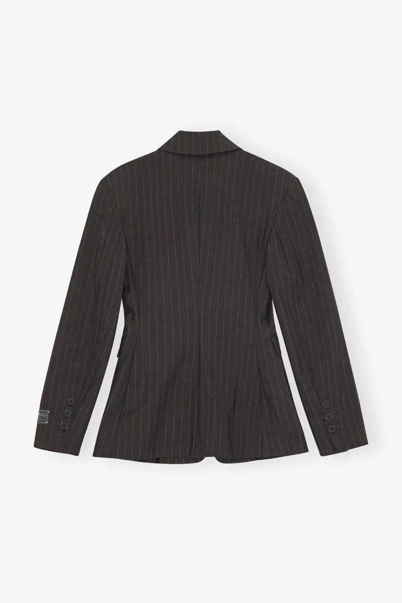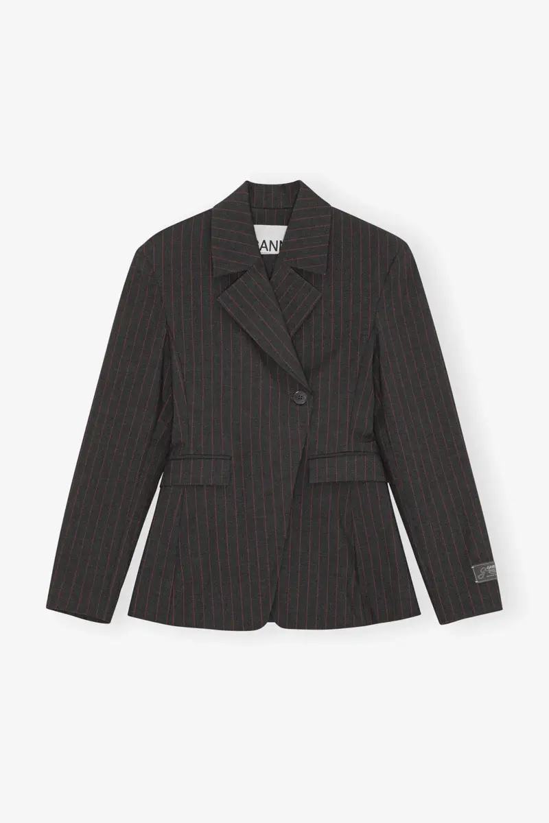 Deze blazer heeft dunne rode krijtstrepen, een enkele knoopsluiting aan de voorkant, reverskraag, twee klepzakken op heuphoogte en een GANNI-logo op een patch.