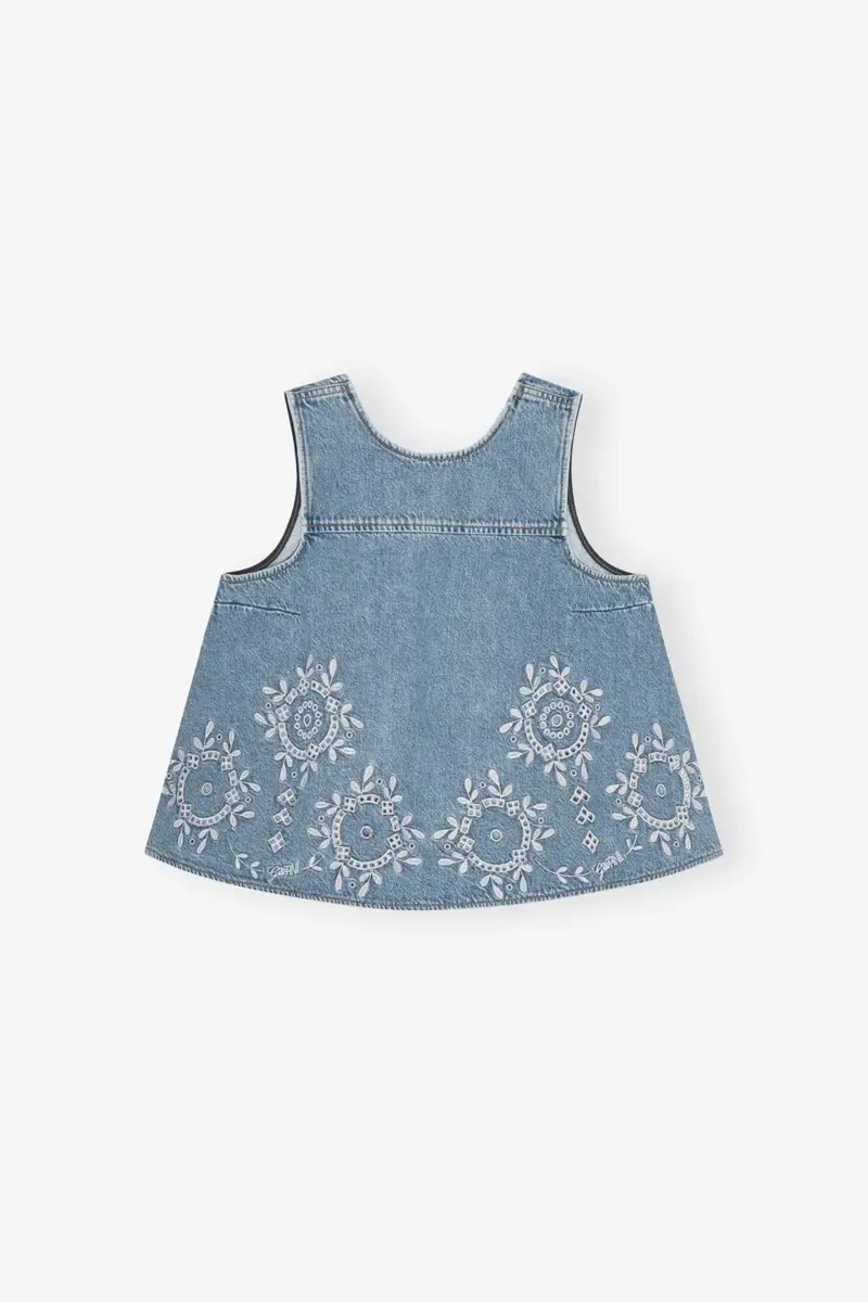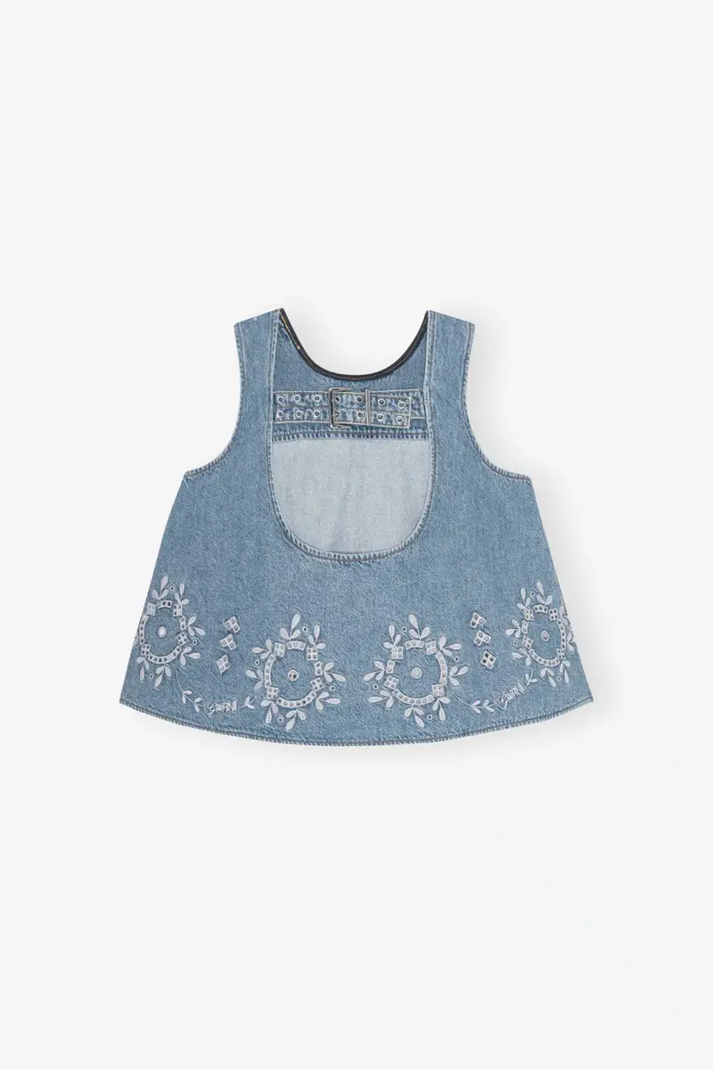 Deze denim top heeft een ronde halslijn, een gespsluiting aan de achterkant en broderie anglaise details aan de zoom.