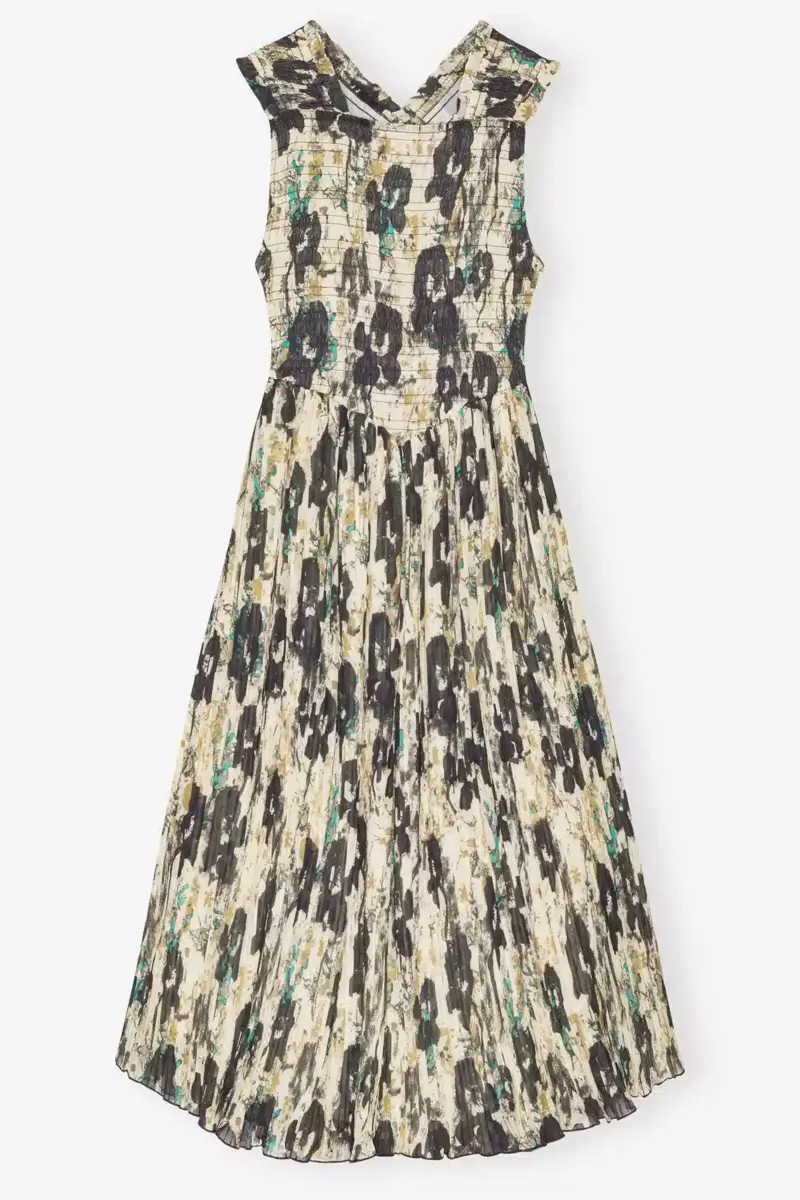 Bedrukte midi-jurk met plooien en smalle bandjes