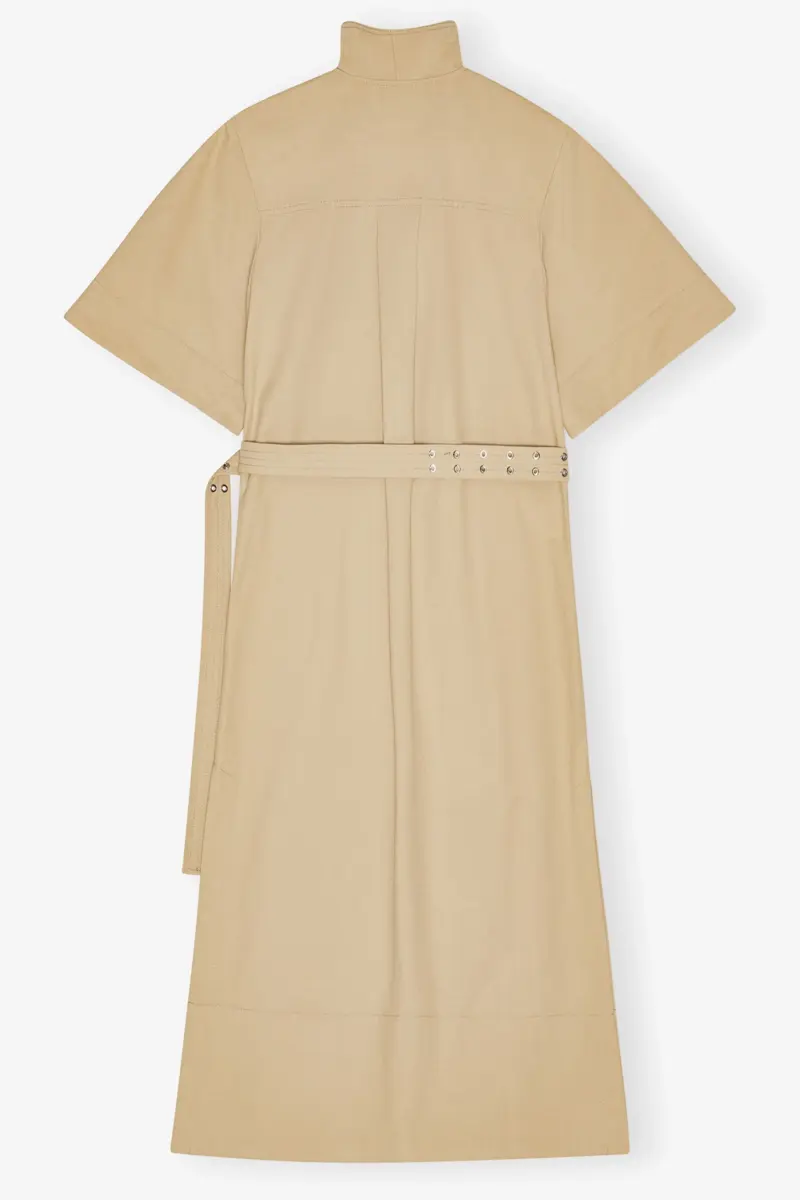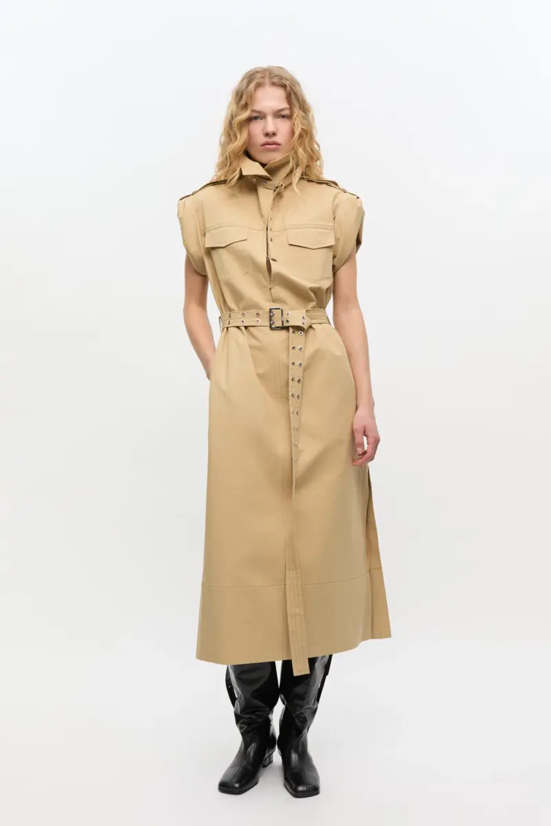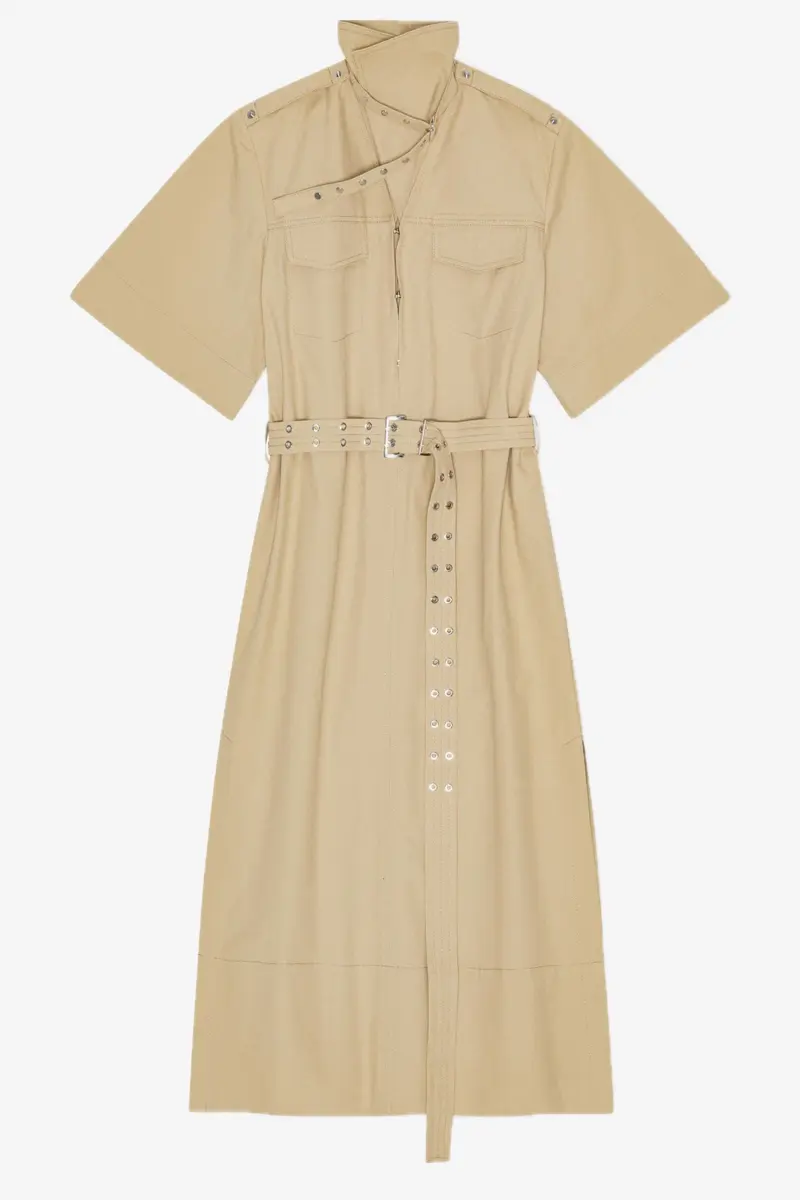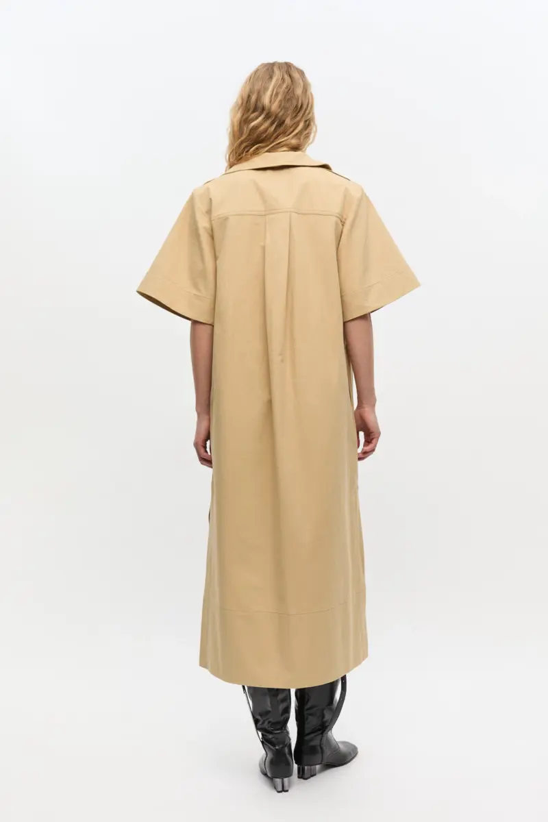 Deze jurk heeft een grote kraag, een diepe V-hals met drie strikbandjes aan de voorkant en knoopdetails op de schouders. De jurk heeft korte verstelbare mouwen, 4 zakken en een bijpassende riem.