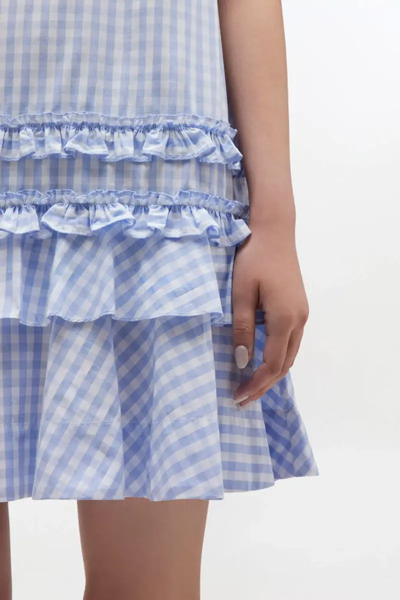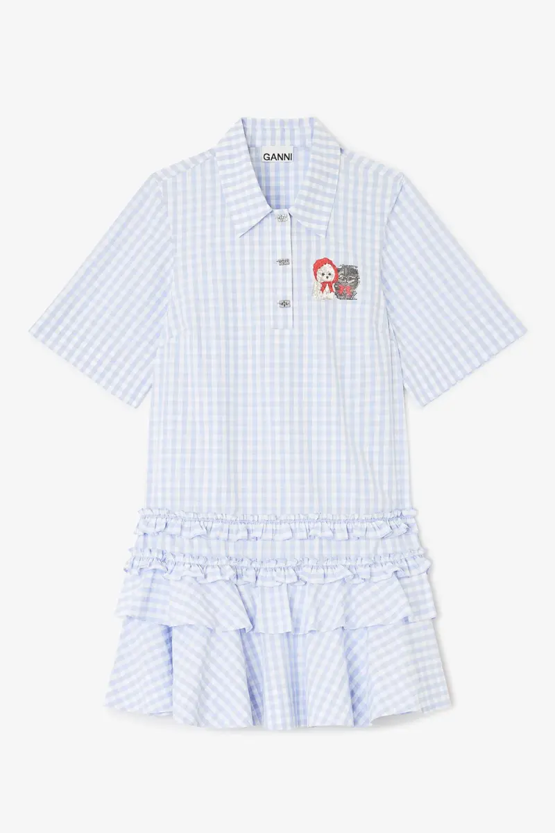 Deze jurk heeft een geruit patroon, een klassieke kraag, een knoopsluiting, een gerimpelde zoom en het GANNI-logo op de achterkant.