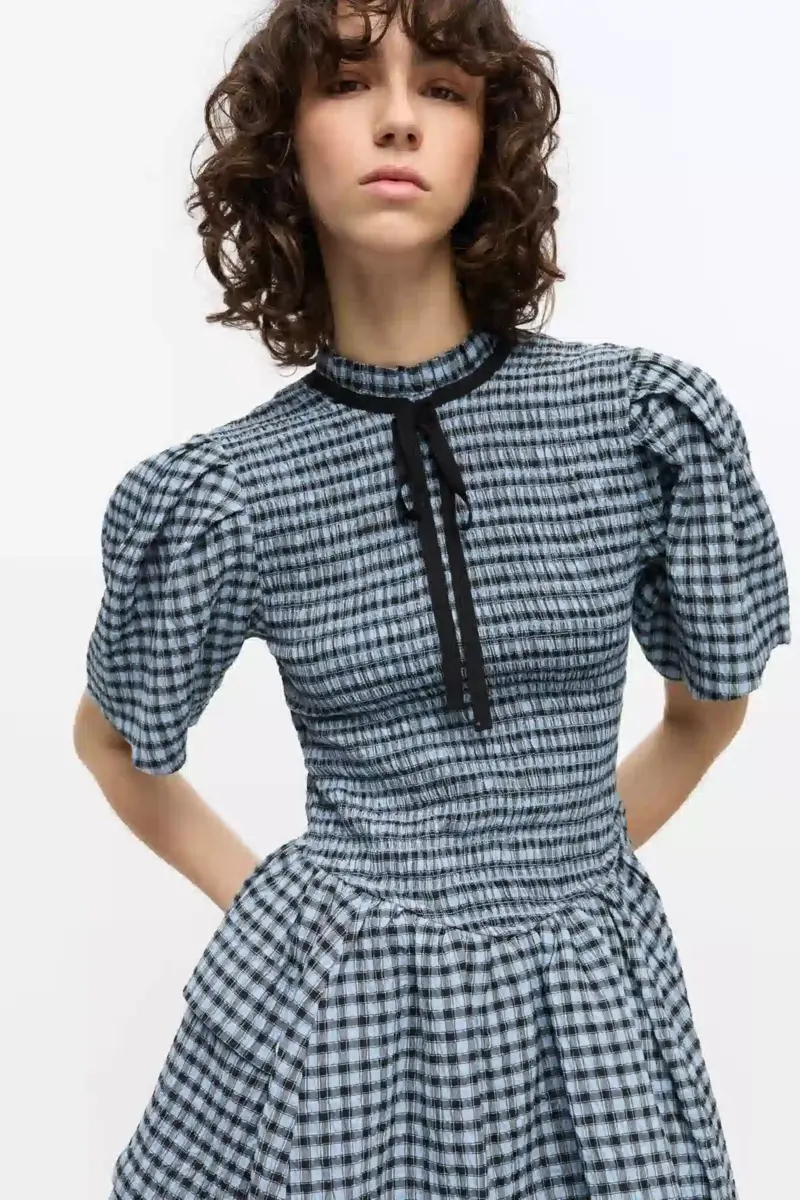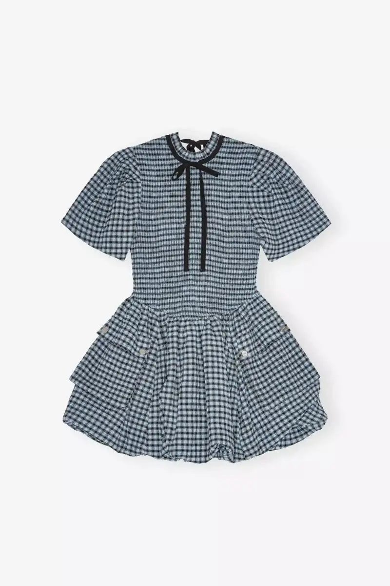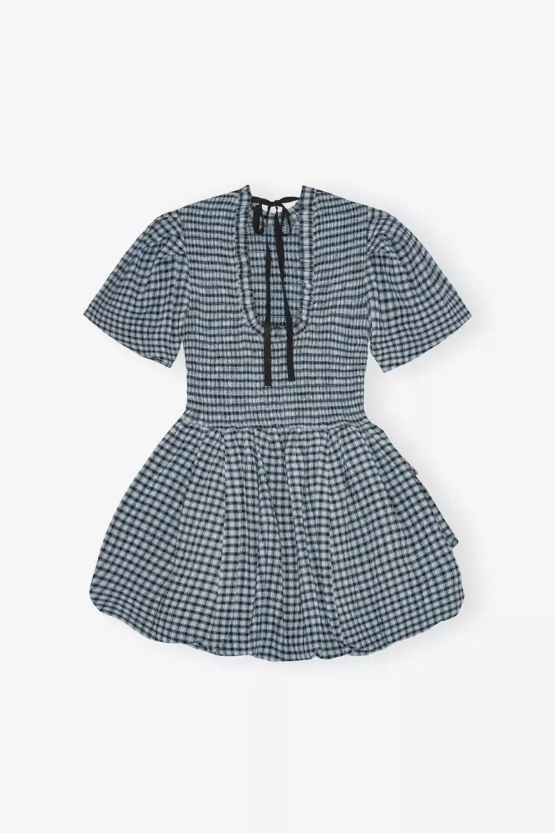 Blauwe seersucker mini-smockjurk met ruitjesmotief