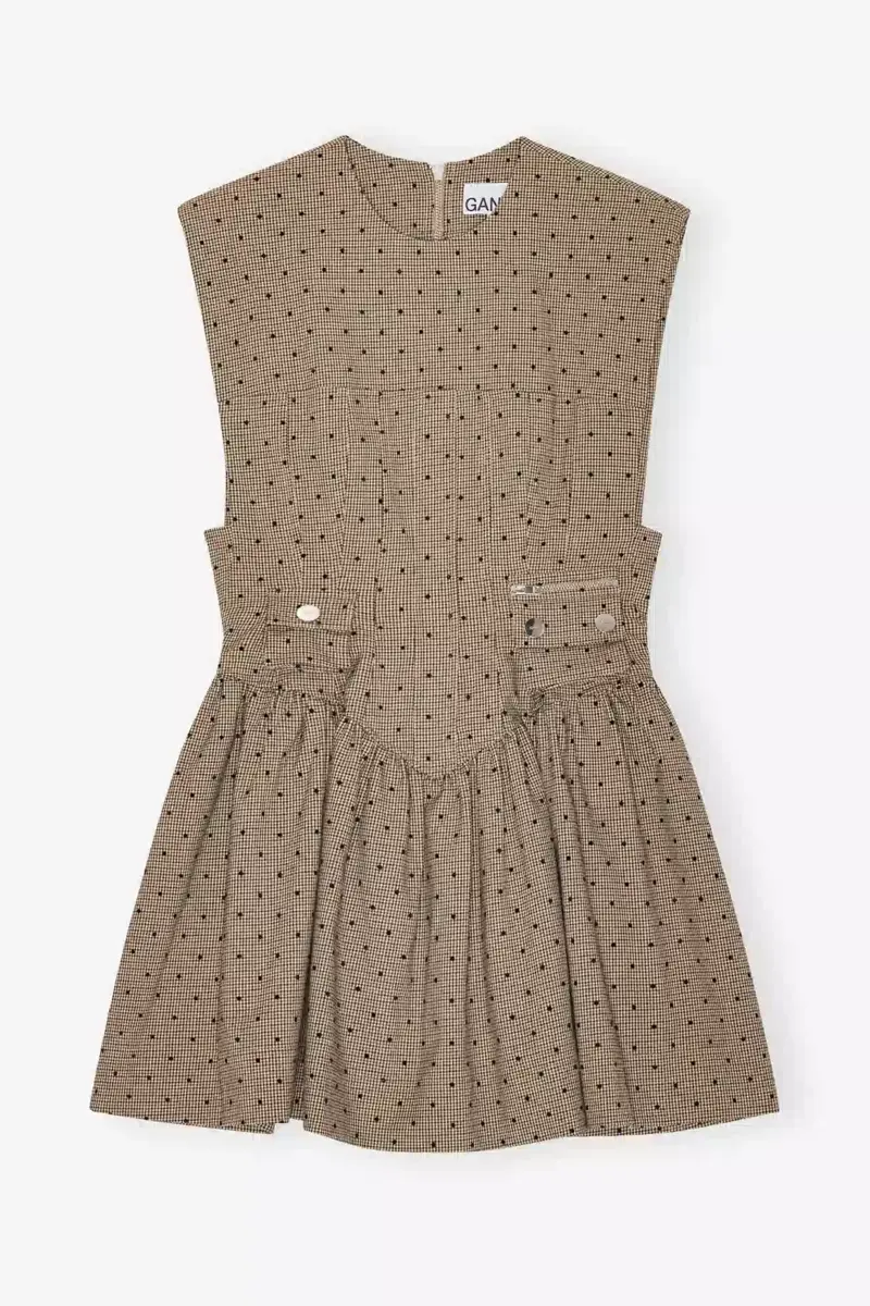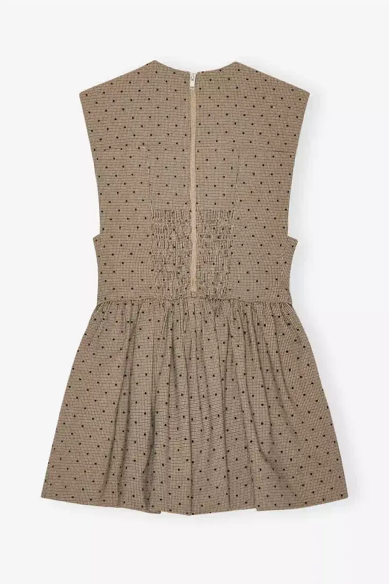 Deze bruine mini-jurk met corset en flockprint is een mouwloze jurk met een ronde halslijn, zakken aan de voorkant, een uitlopende rok, een ritssluiting aan de achterkant en een smockdetail op de rug.