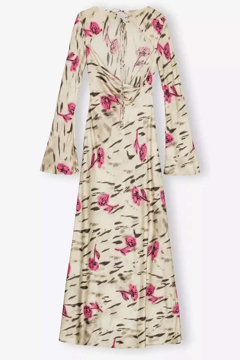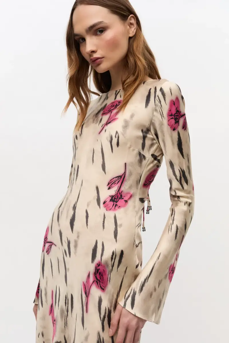Deze jurk van stretch satijn met bloemenprint heeft een ronde hals, lange mouwen en een open rug met strikbandjes.