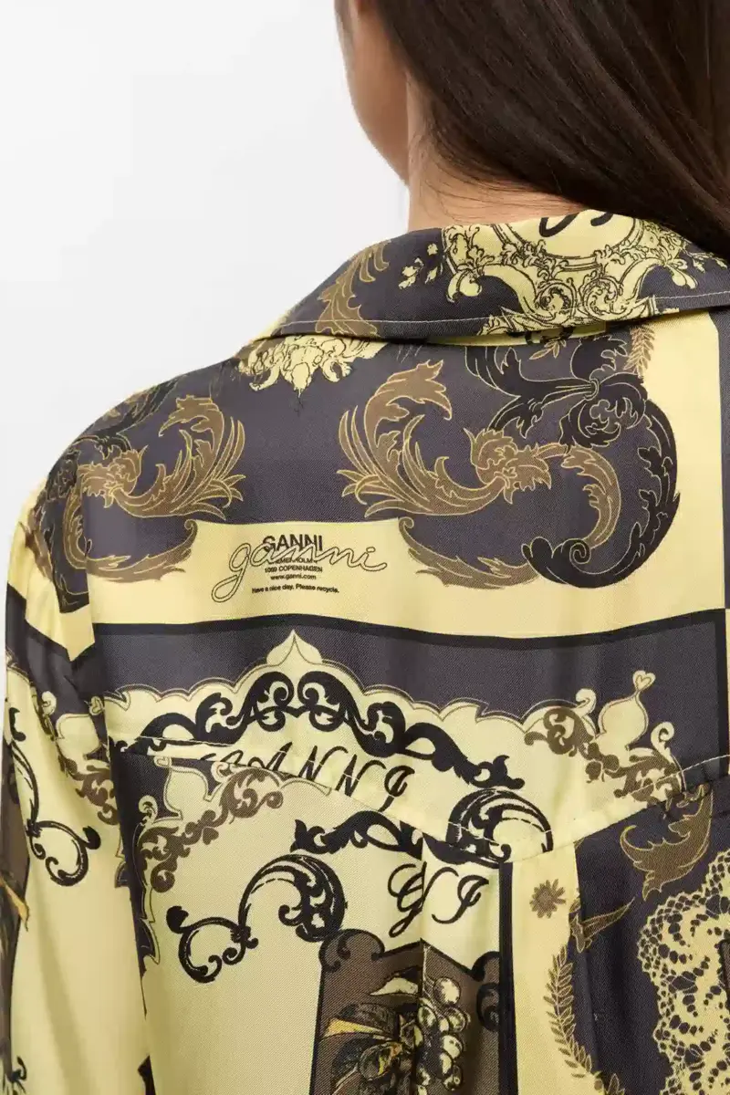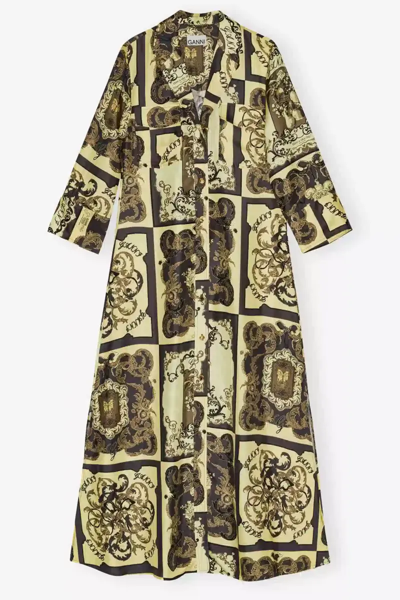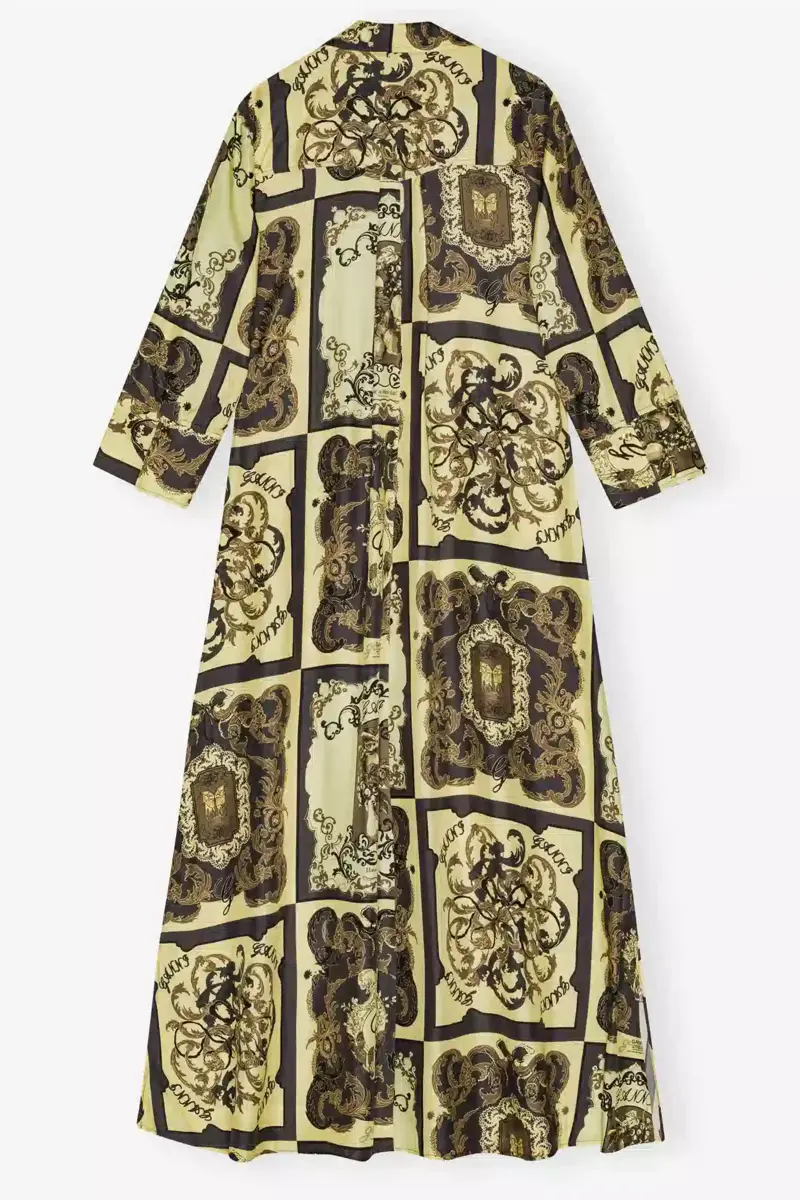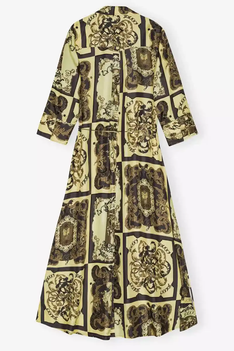 Deze jurk heeft een sierlijke print. De jurk is gemaakt van zijdesatijn en heeft een knoopsluiting aan de voorkant en een bijpassende riem.