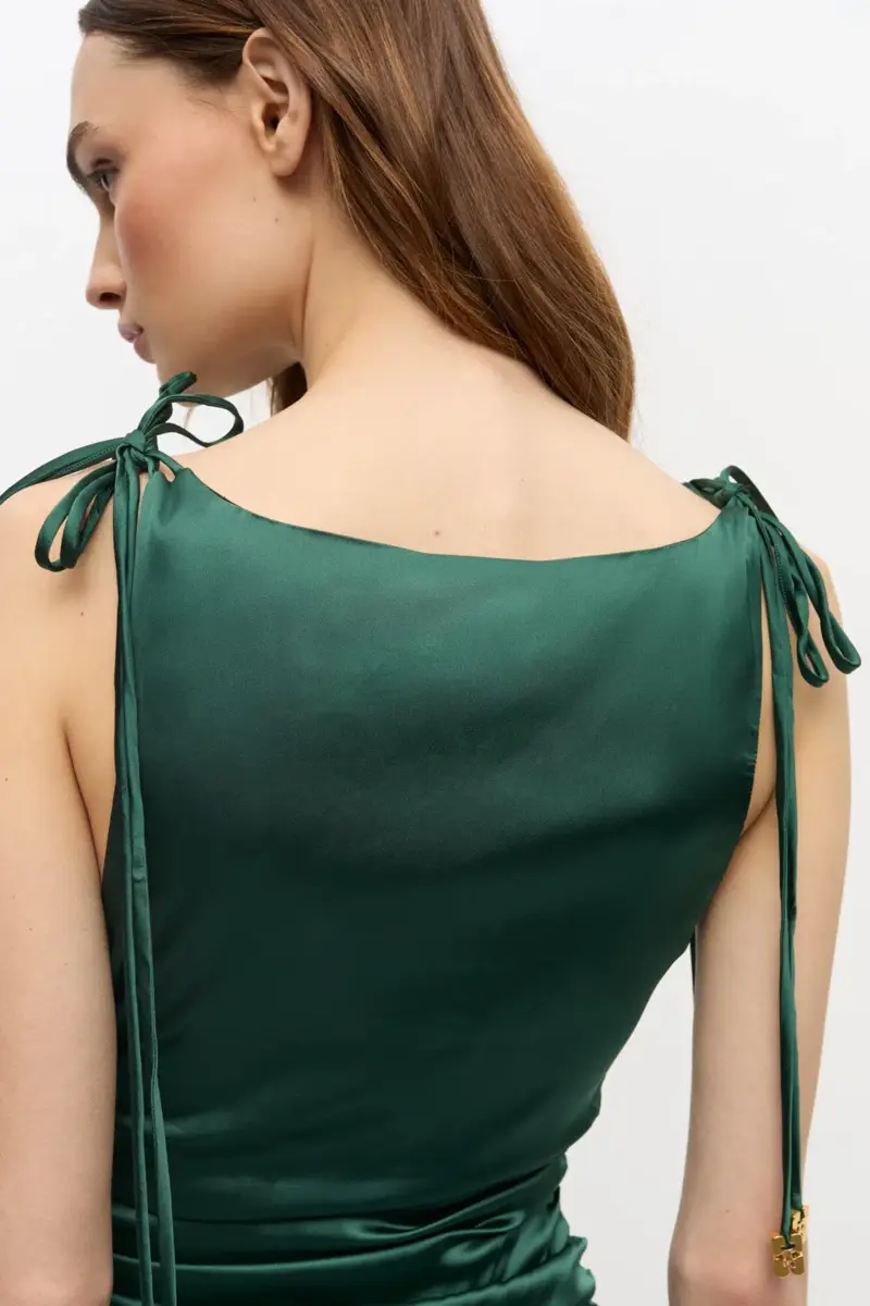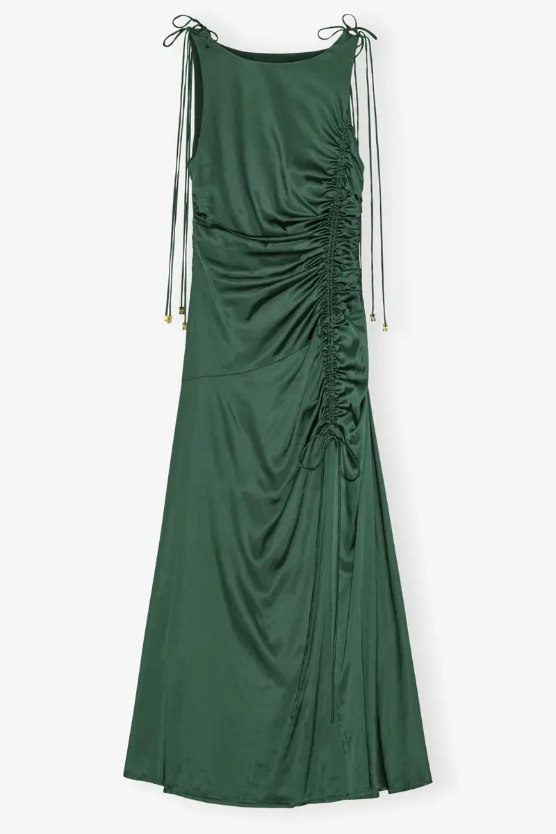 Deze jurk heeft een ronde halslijn, verstelbare schouderbandjes, ruches langs het lijfje en een hoge split met GANNI Butterfly-logo en strikbandjes.