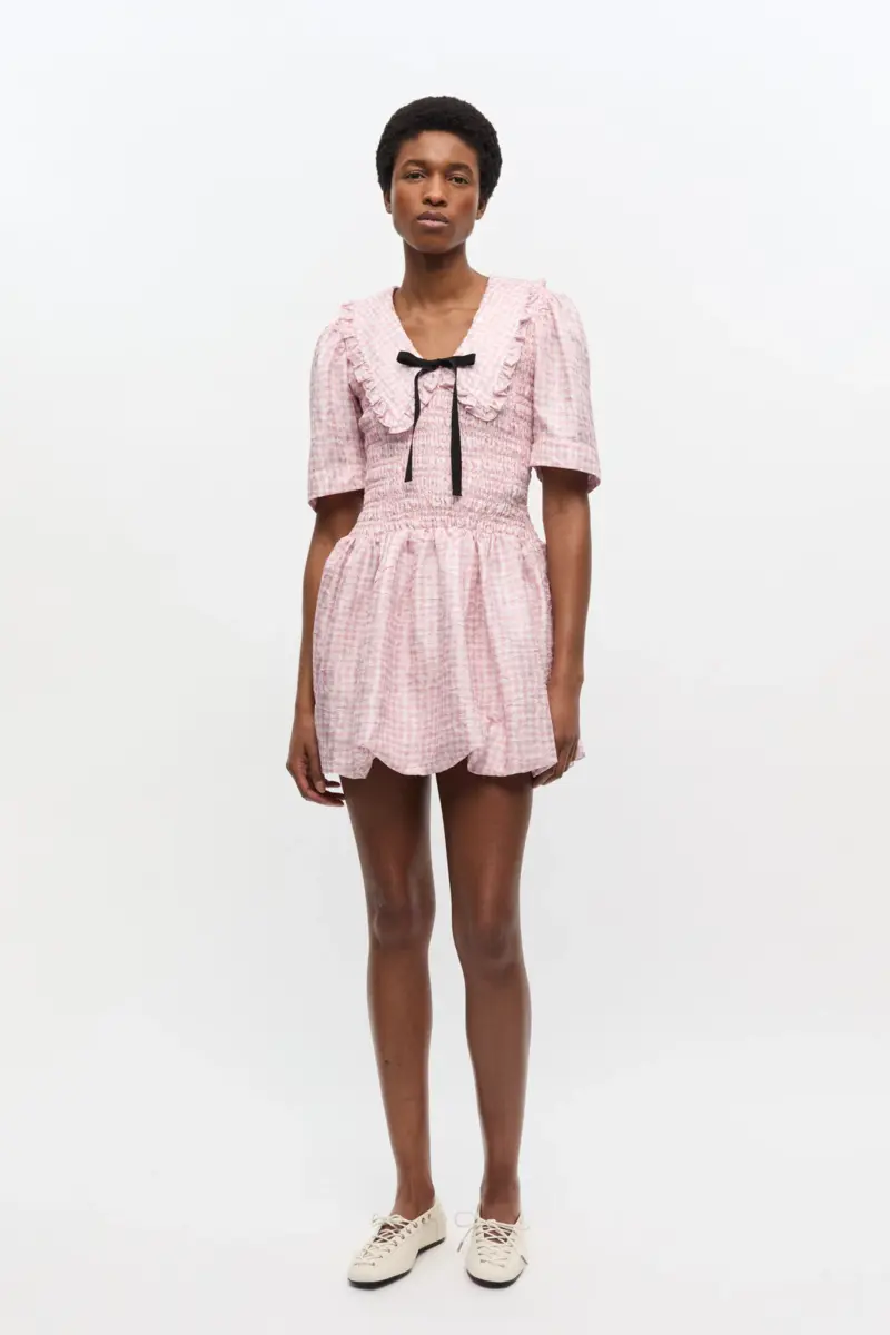 Deze jurk heeft een roze ruitjesprint, een gesmokt lijfje met een bubbelzoom en een zwarte strik.