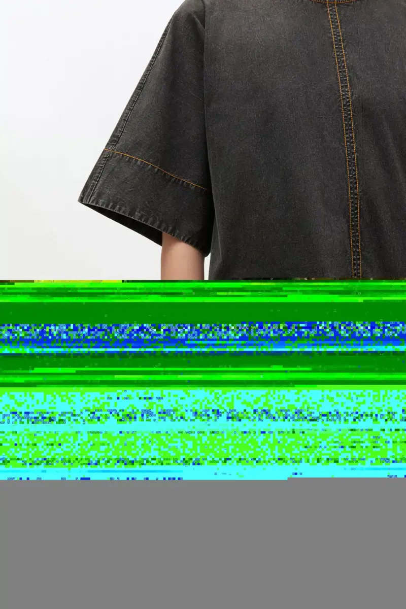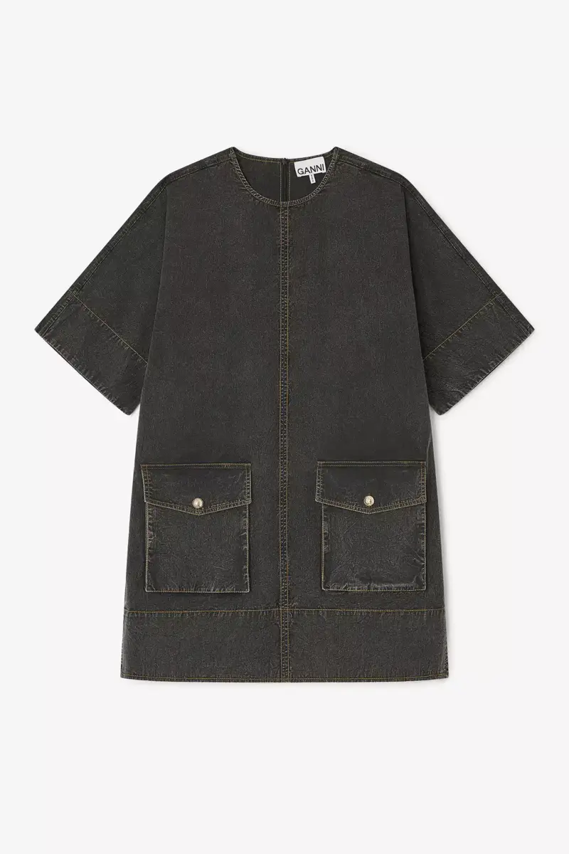 Deze jurk heeft een ronde hals, korte mouwen, 2 zakken aan de voorkant en contrasterende stiksels.