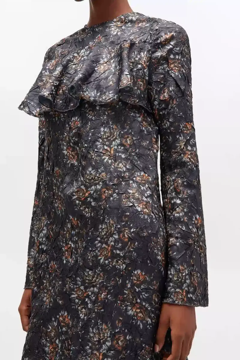 Deze jurk heeft een romantische bloemenprint, shibori-plooien en ruches.