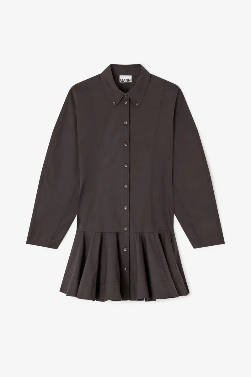 Deze jurk heeft een klassieke kraag, knoopsluiting aan de voorkant, een verlaagde taille en een gerimpelde zoom.