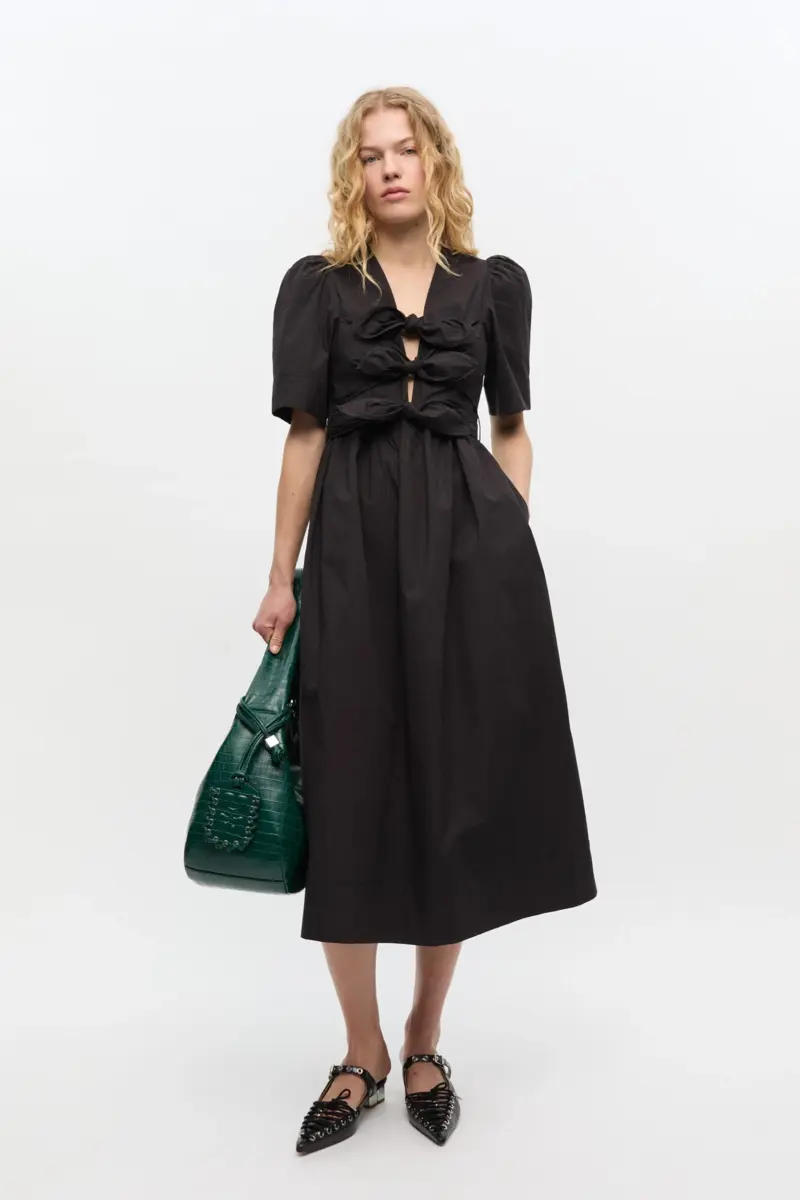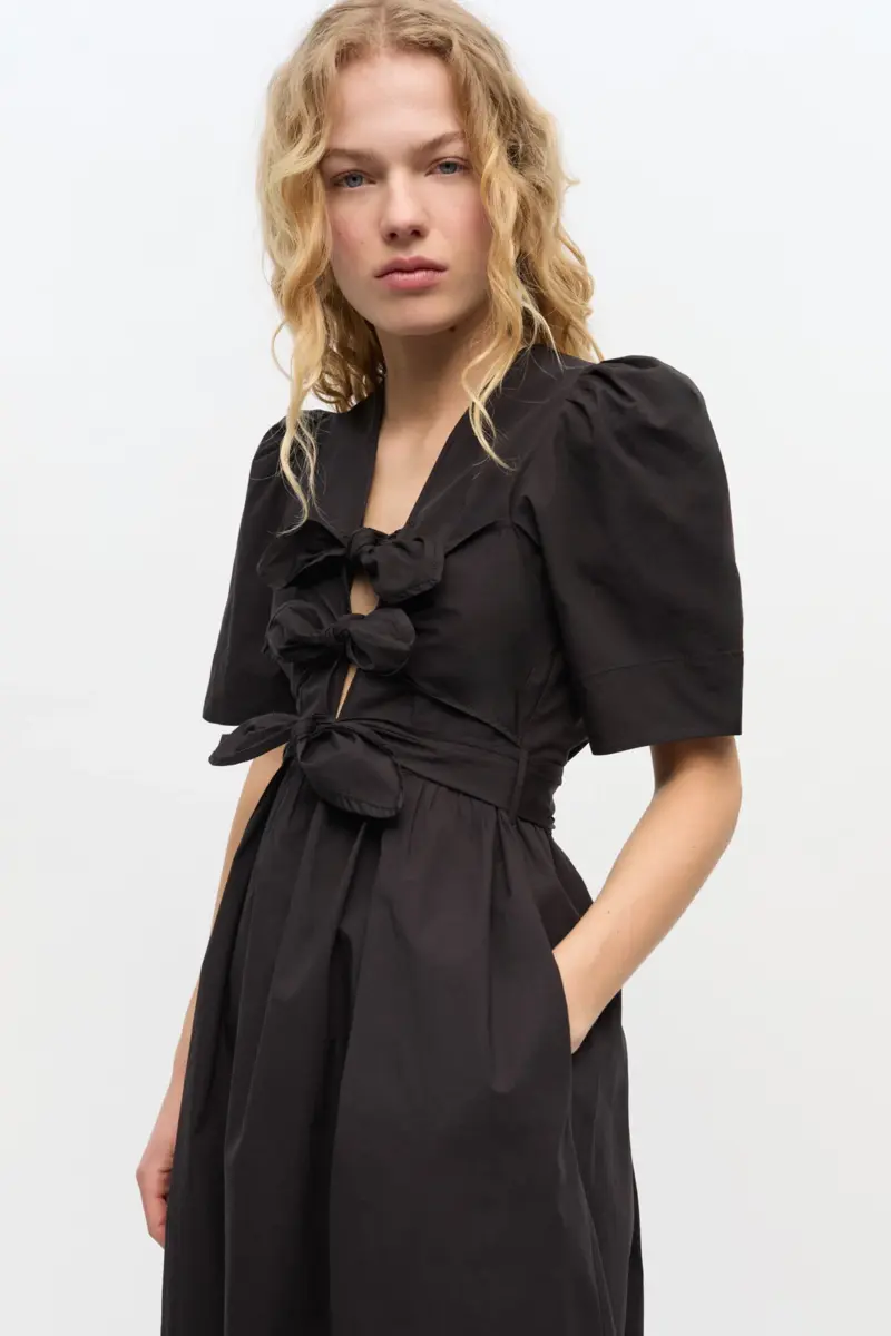 Deze jurk heeft een diepe V-hals met drie strikbandjes aan de voorkant, riemlussen, korte pofmouwtjes, steekzakken en een uitlopende rok.