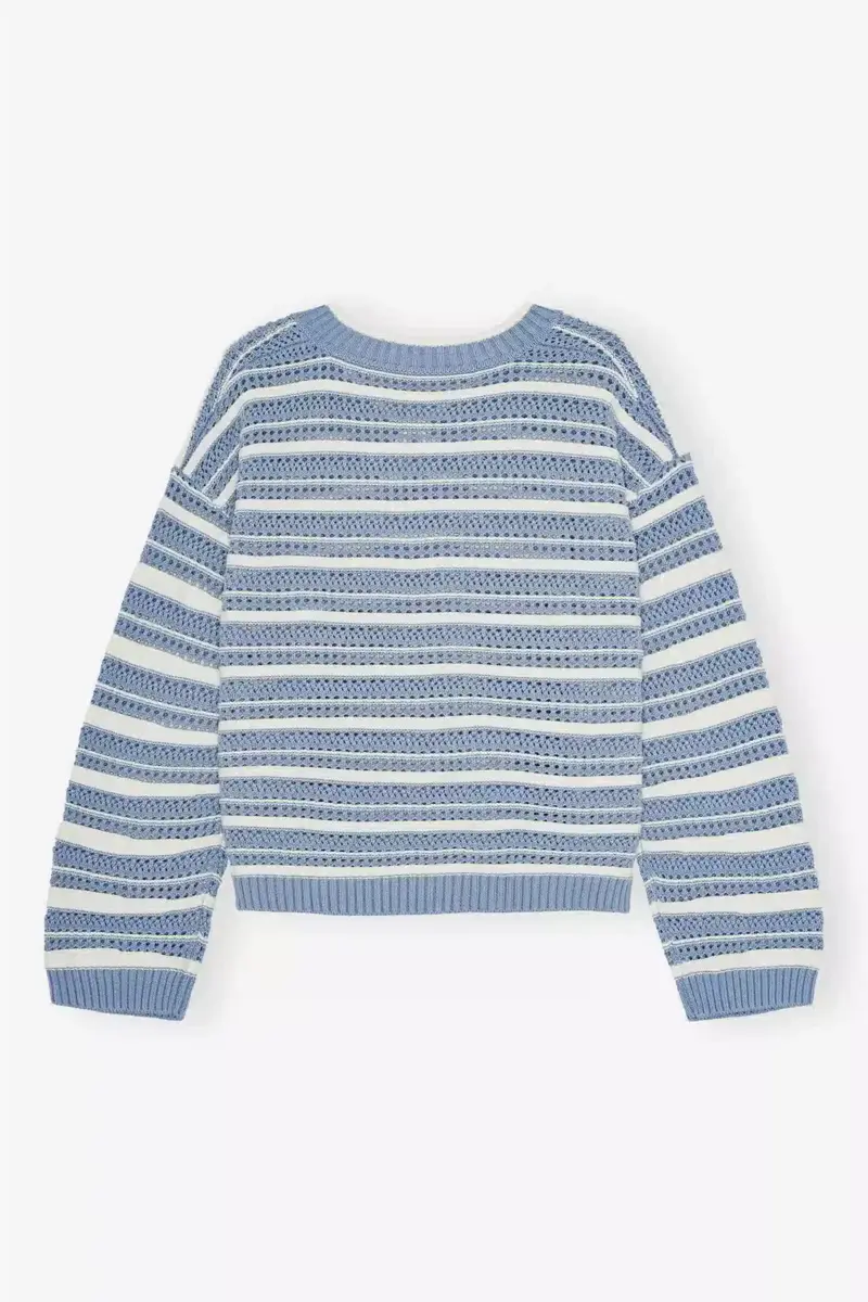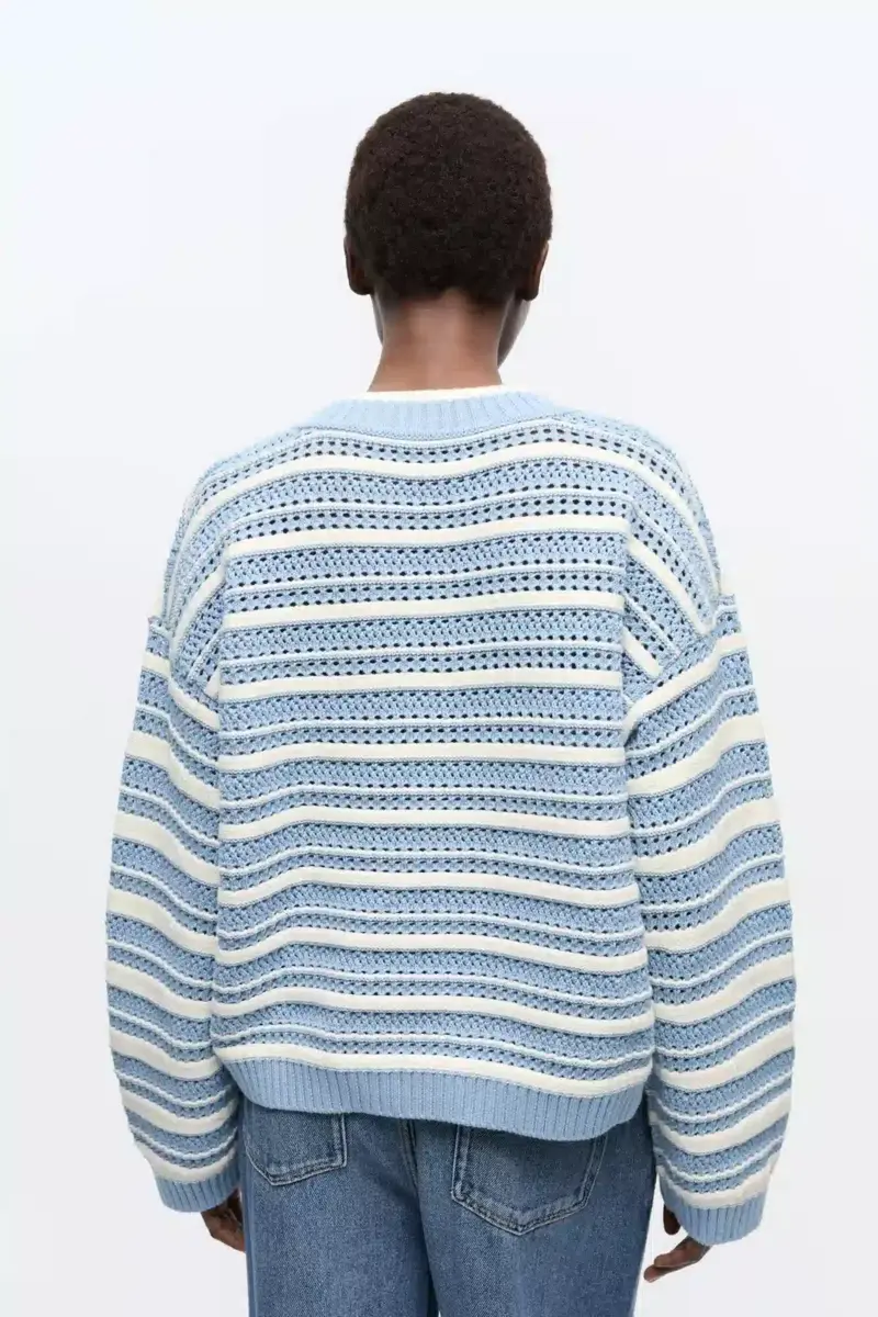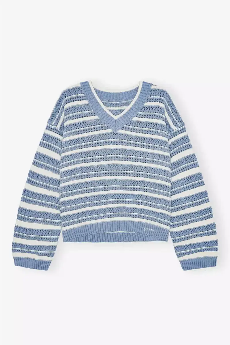 Deze trui heeft een V-hals, lange mouwen en geribde boorden.
