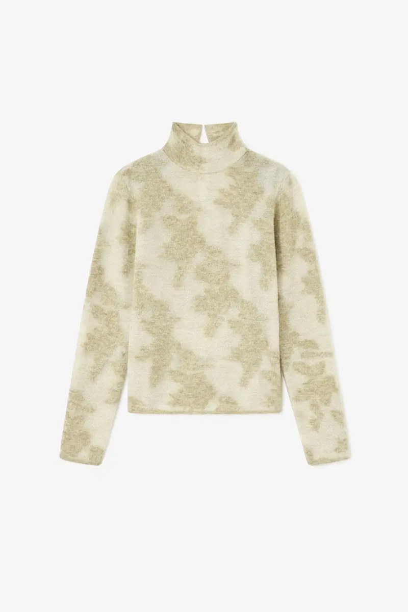 Deze coltrui heeft een transparante bloemenprint, een hoge kraag en lange mouwen.