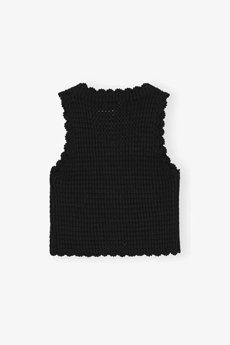 Deze gebreide top heeft een kantontwerp van biologisch katoen en kasjmier. Hij heeft een mouwloos silhouet met een striksluiting en goudkleurige details.