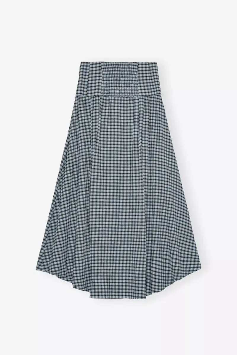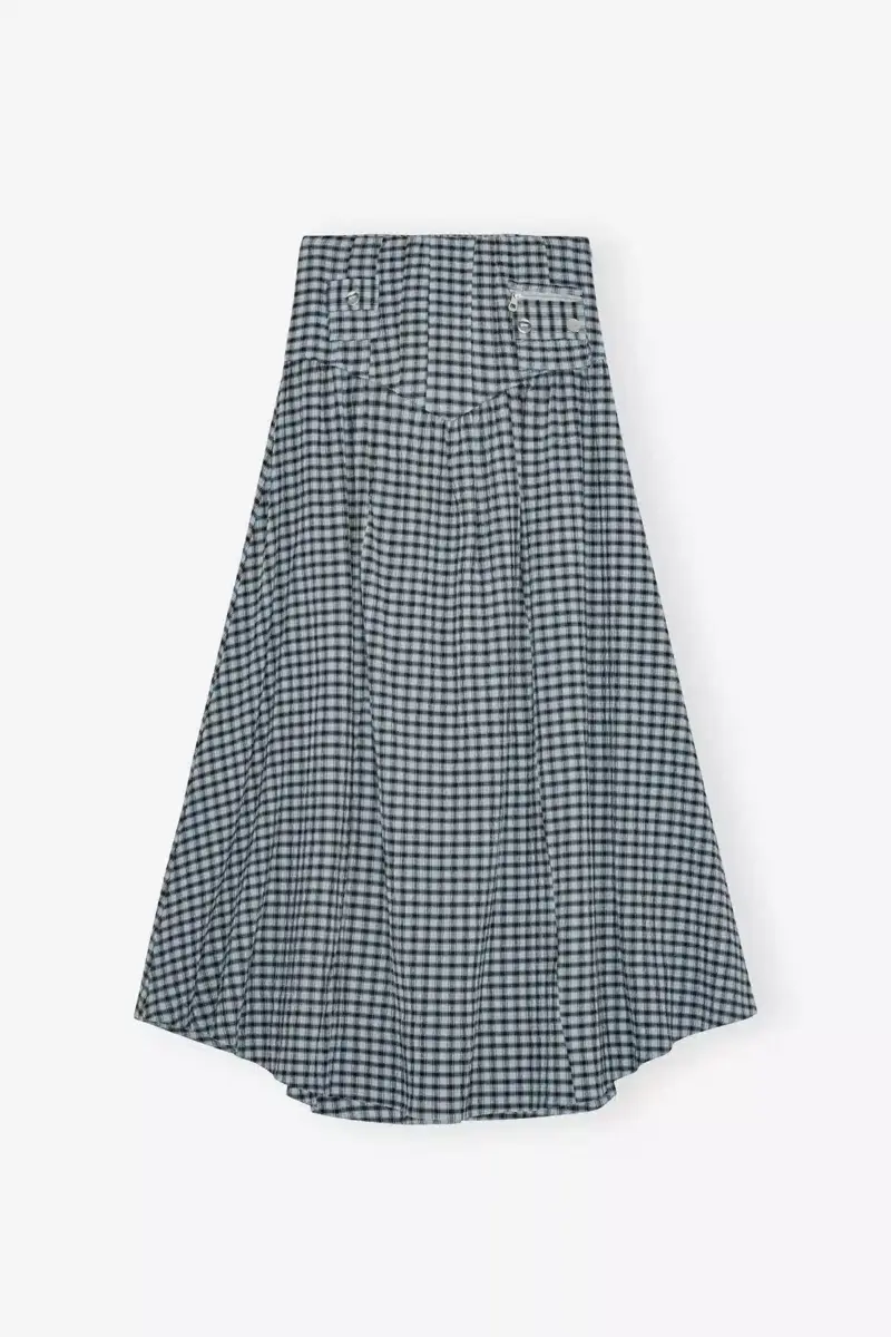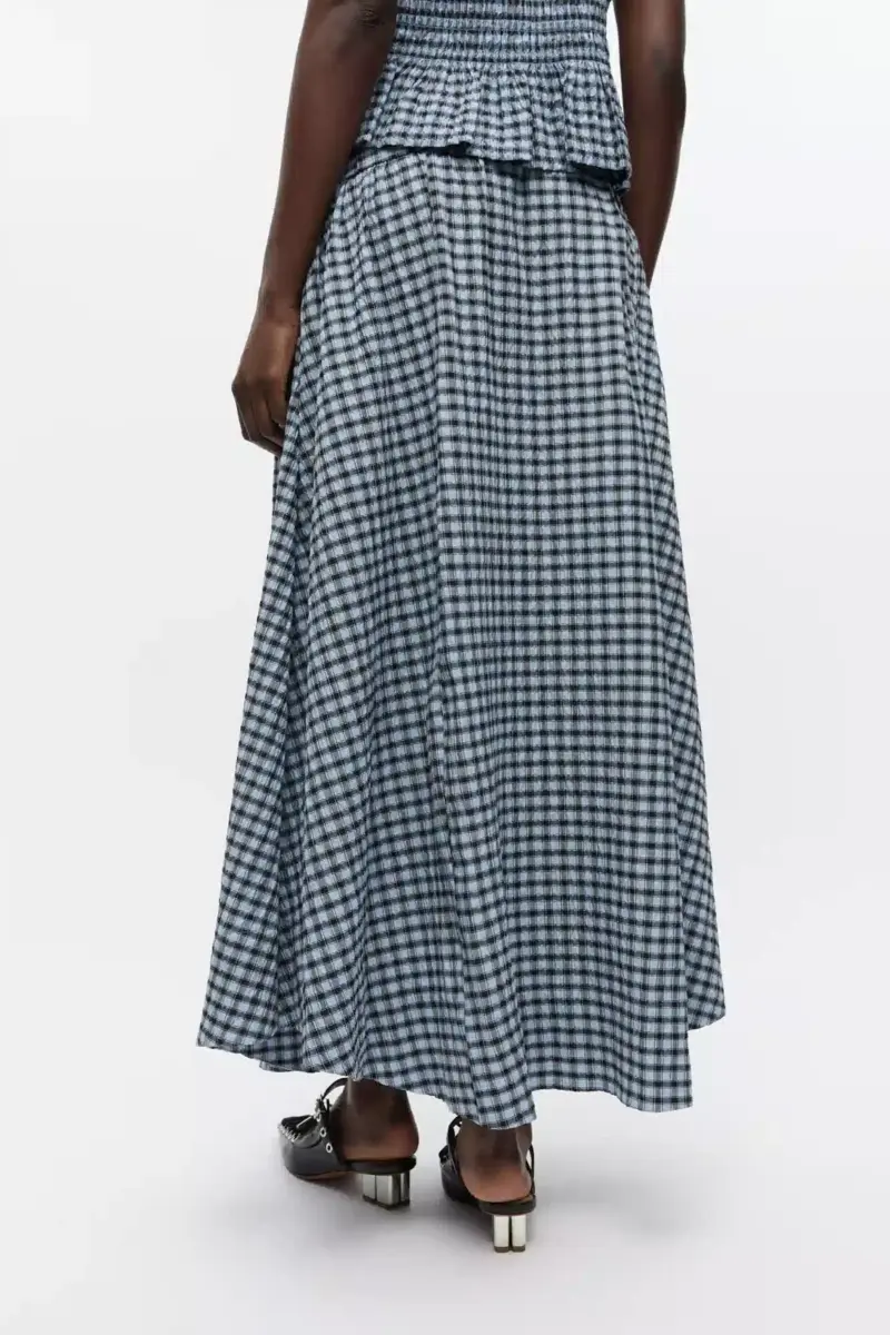 Deze blauwe seersucker geruite lange rok heeft twee zakken aan de voorkant en een verlaagde taille.