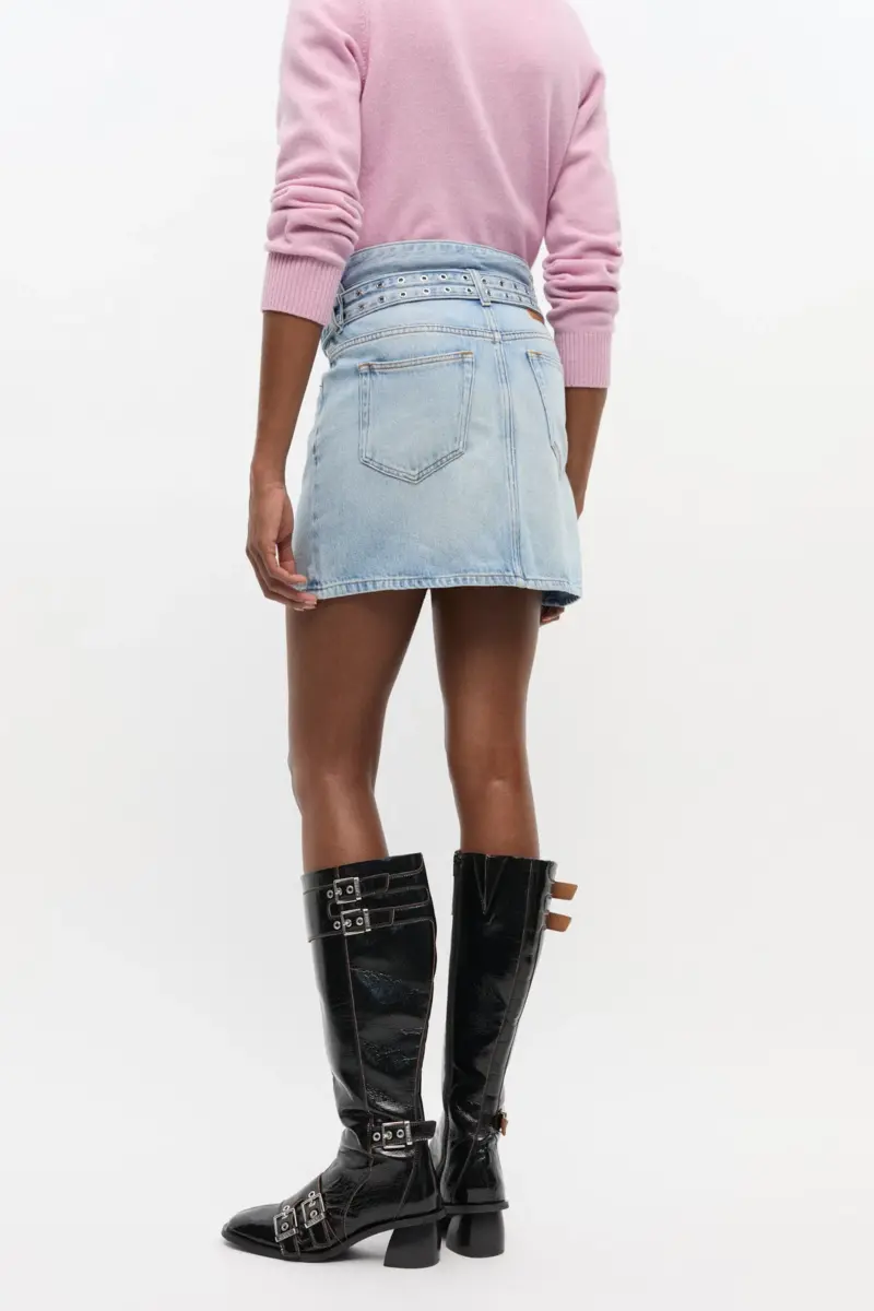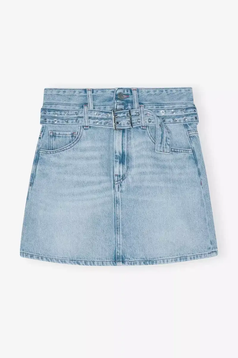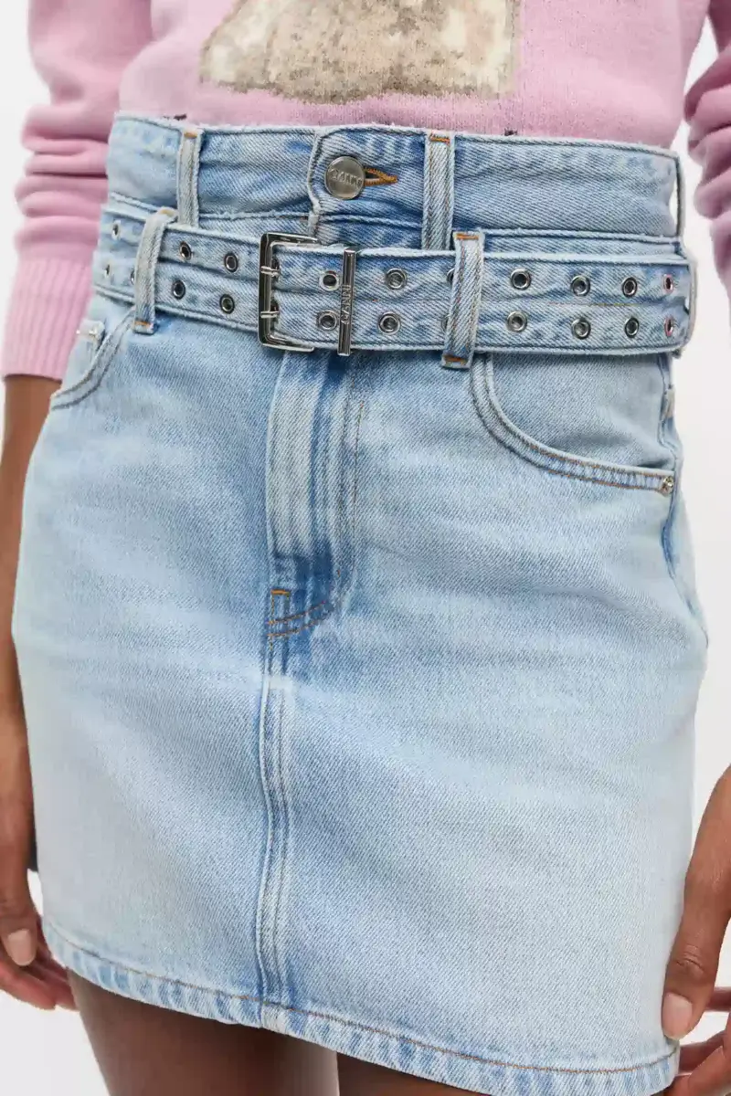 Deze rok is gemaakt van lichtblauwe denim met een stonewashed afwerking en heeft een dubbele riem met metalen oogjes. Hij heeft een klassiek ontwerp met vijf zakken en een ritssluiting en knoopsluiting aan de voorkant.