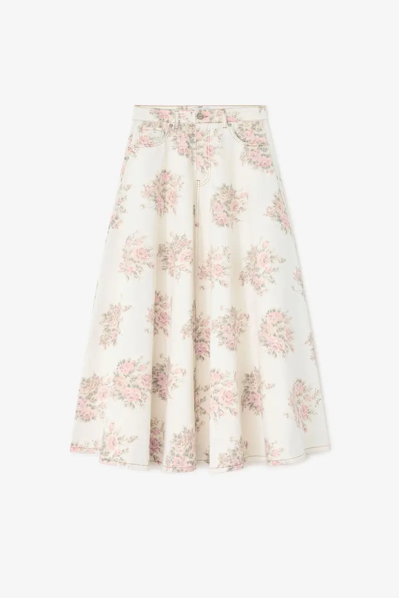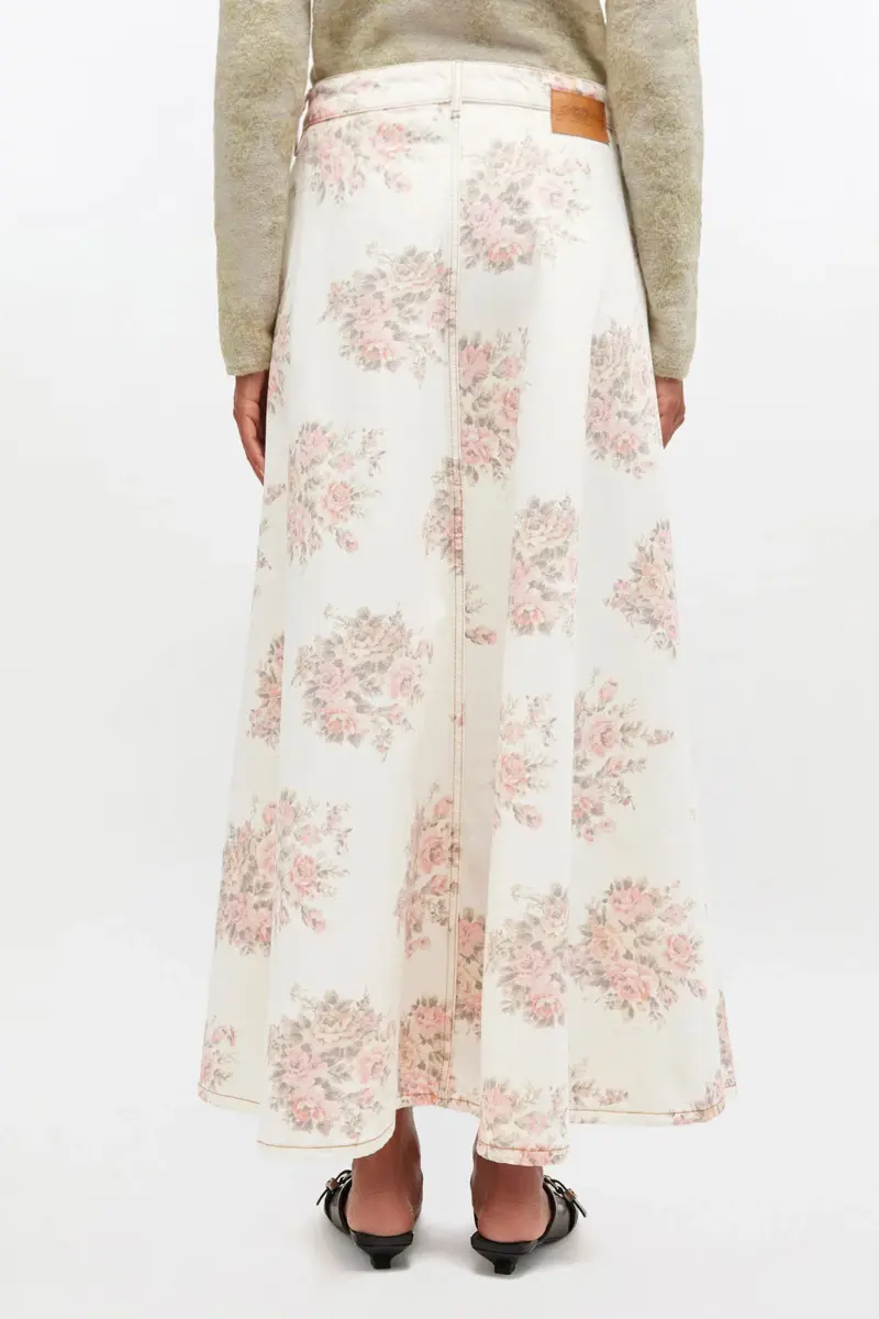 Deze rok van denim met bloemenprint heeft een ritssluiting met knoop, vijf zakken, riemlussen en een GANNI-logapatch op de achterzak.