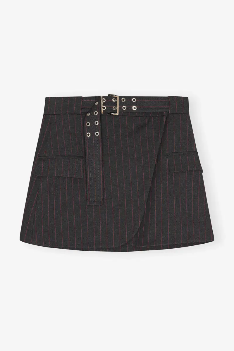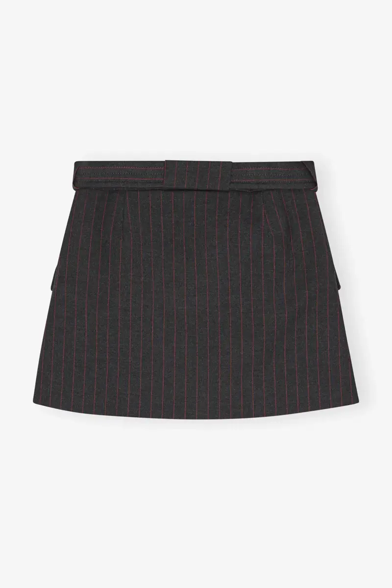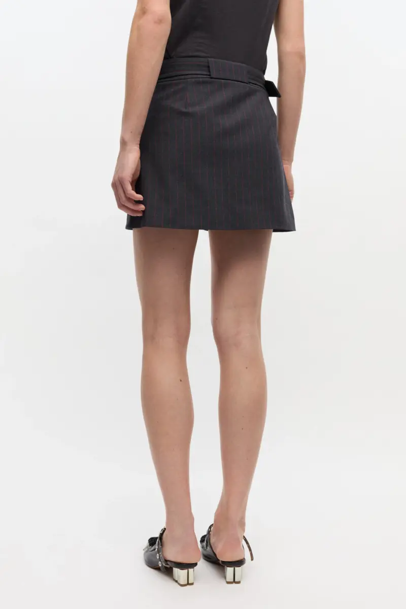 Deze rok heeft een dun rood krijtstreepmotief, een bijpassende riem met metalen oogjes en zakken aan de voorkant.