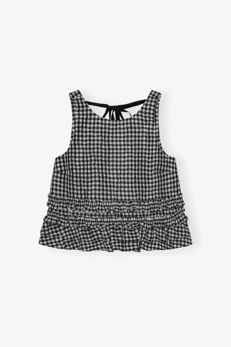 Deze top heeft een zwart-wit ruitjespatroon en een gekreukelde textuur. De top is ontworpen met een open rug, strikband en ruches.