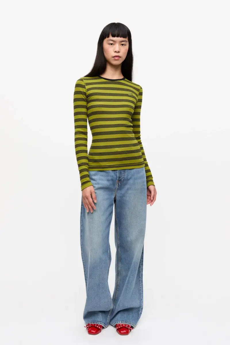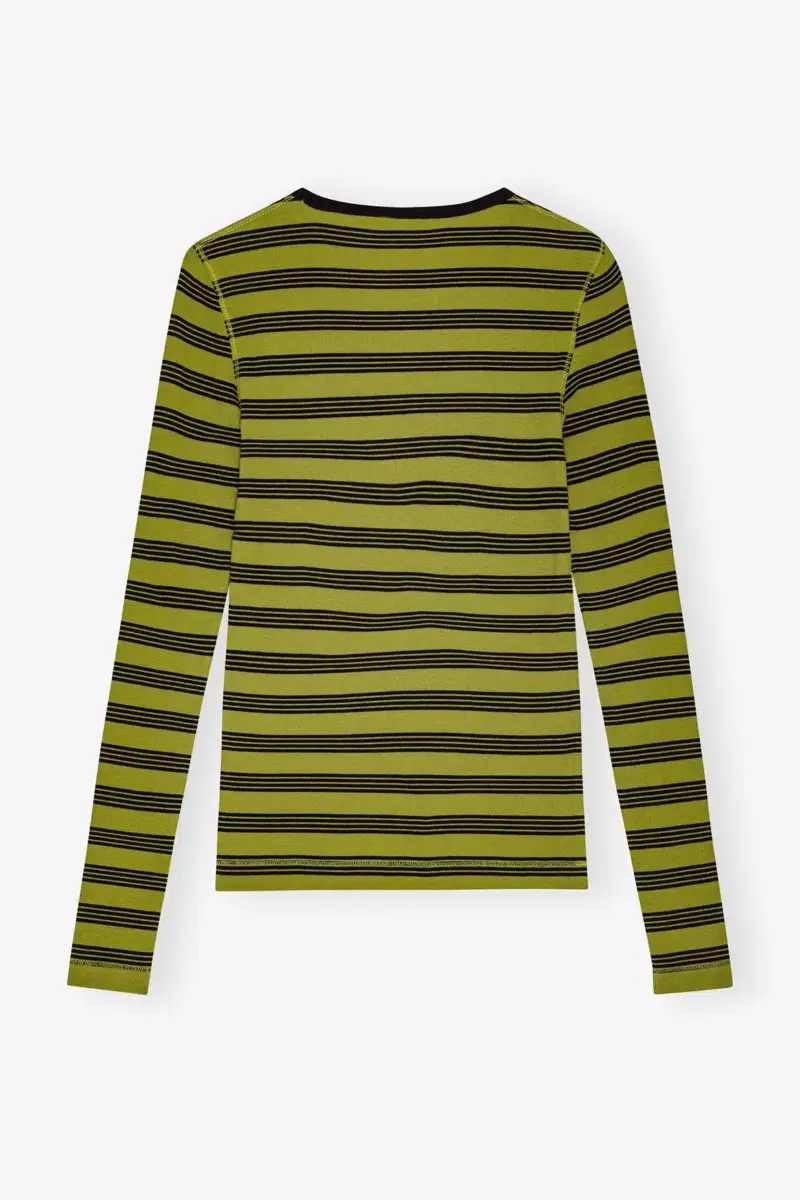 Dit gestreepte T-shirt met lange mouwen van zacht geribbeld katoen heeft een ronde halslijn, een ton sur ton GANNI-vlinderlogo en lange mouwen.