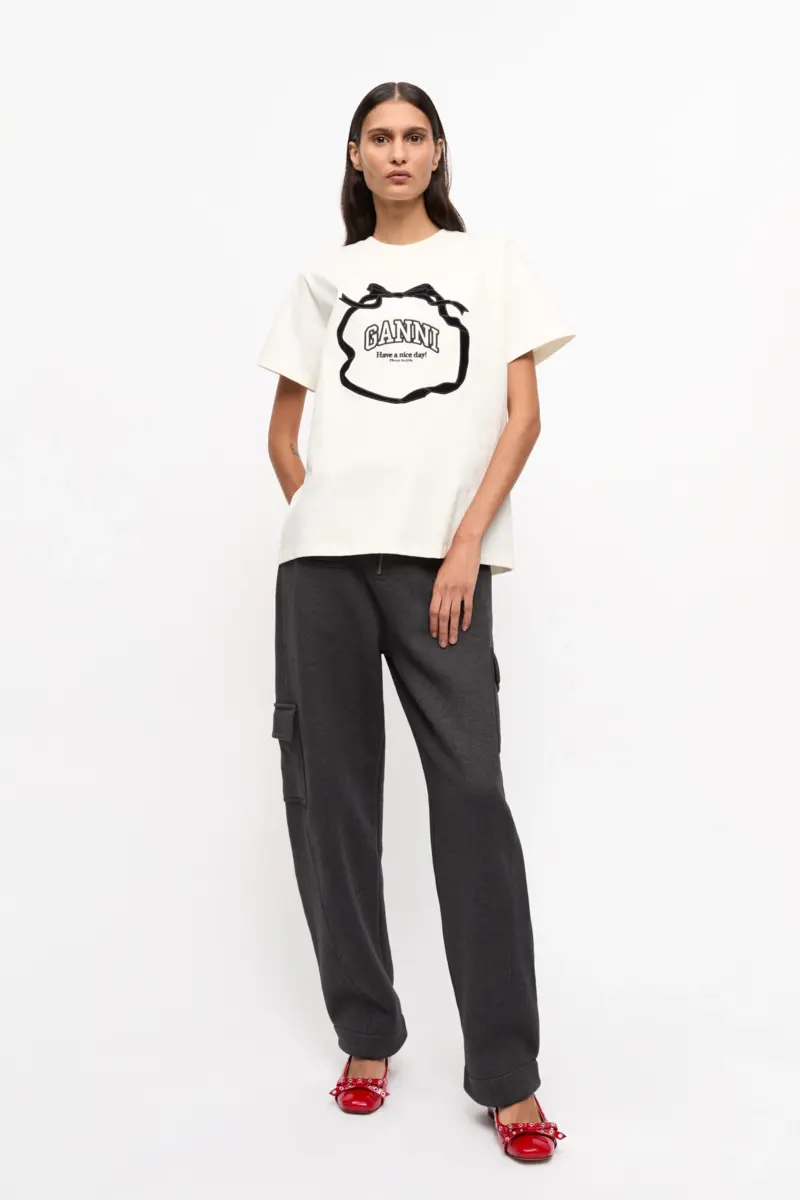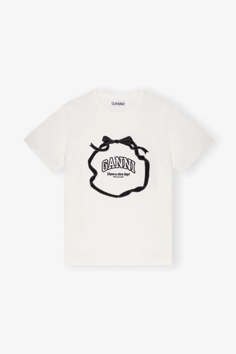 Dit T-shirt heeft een ronde halslijn en korte mouwen. Het T-shirt is voorzien van een gedrukt zwart lint en strik, een GANNI-logo en de tekst ‘Have a nice day! Please recycle’.
