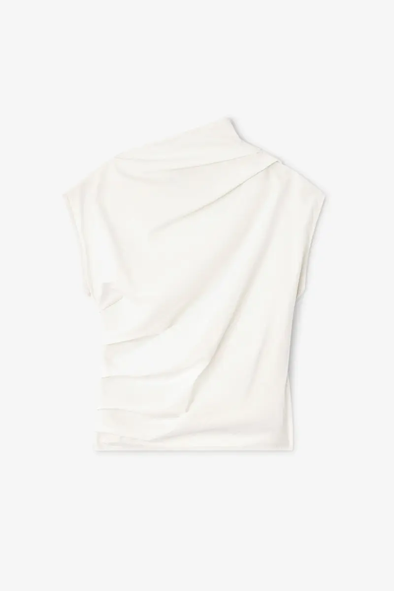 Deze top heeft een asymmetrische halslijn en ruches aan de zijkant.