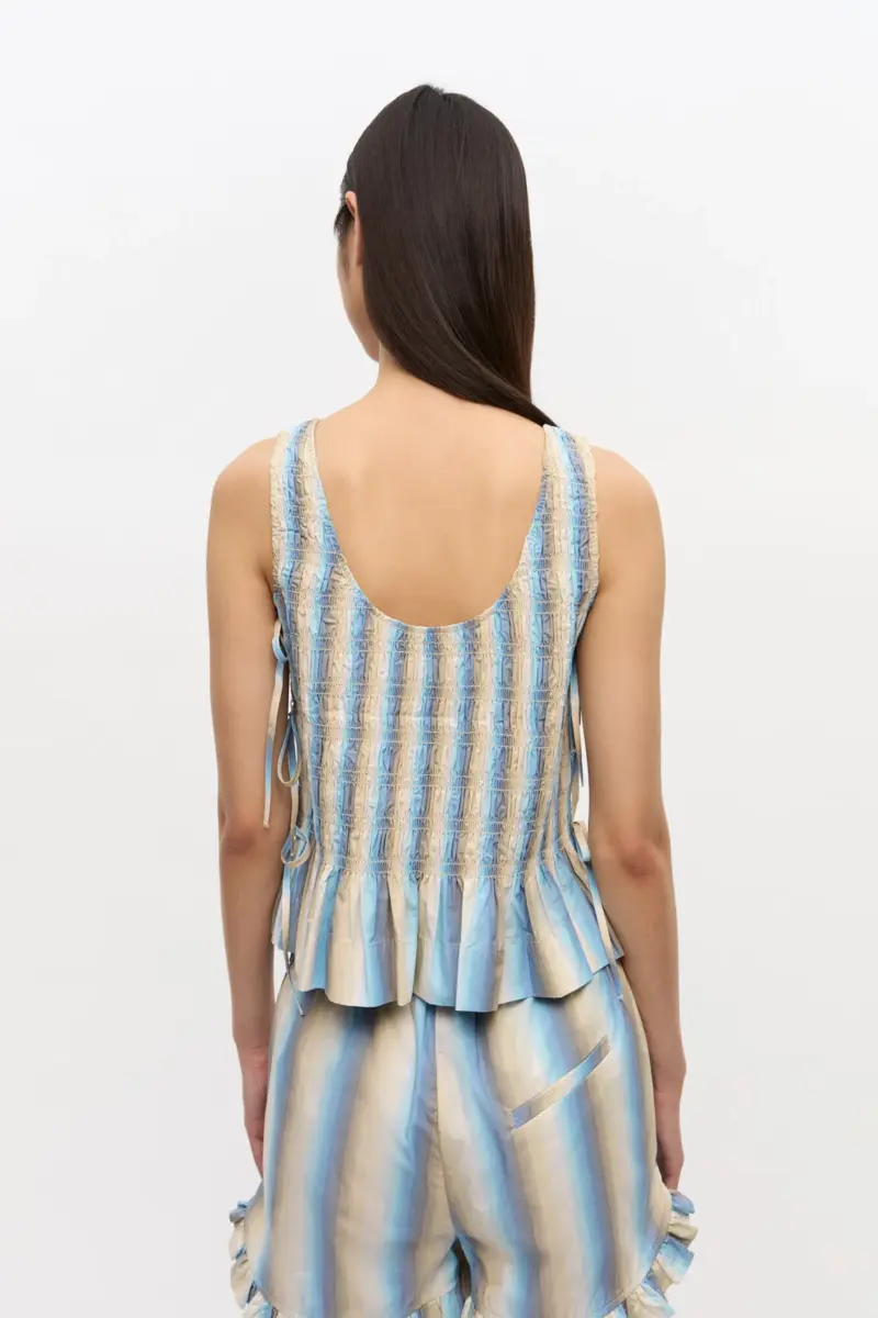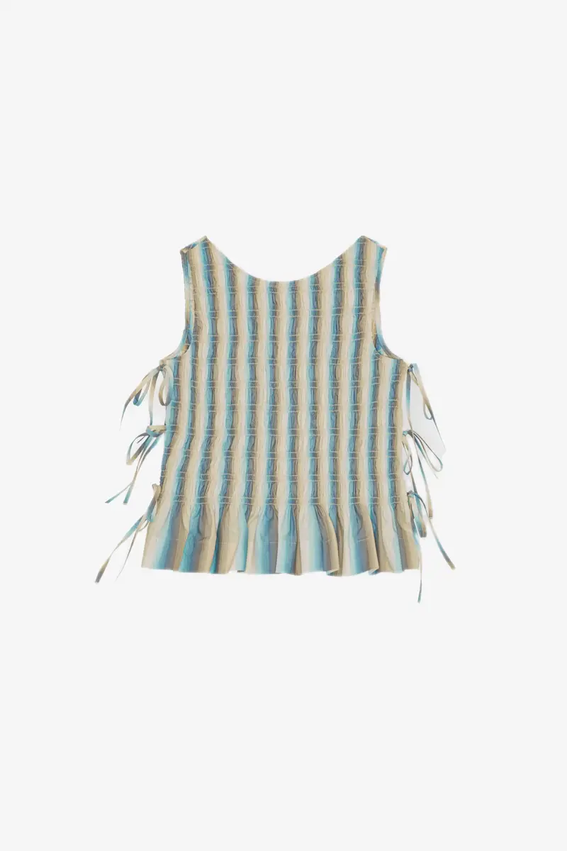 Deze top is mouwloos en heeft een gesmokte textuur, strikdetails aan de zijkanten, een ronde rug en een gerimpelde zoom.