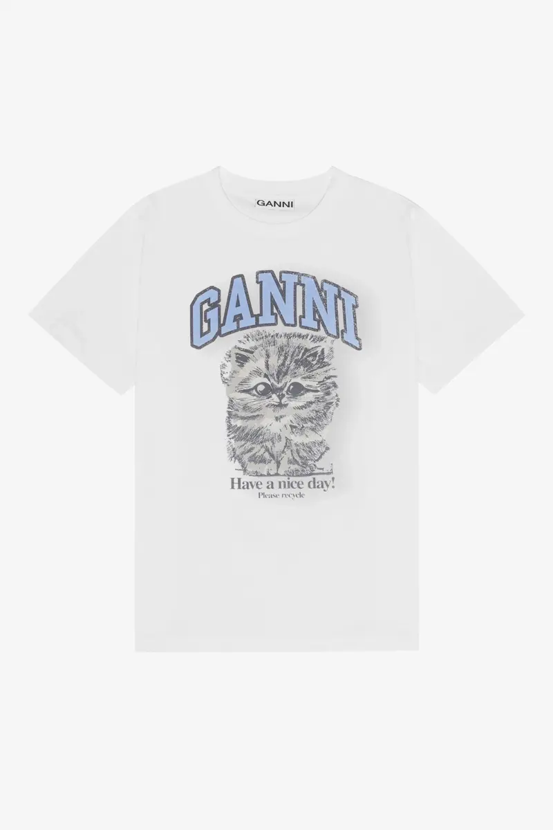 Dit witte, relaxte jersey T-shirt met kat heeft een ronde halslijn, korte mouwen en een GANNI-logo.