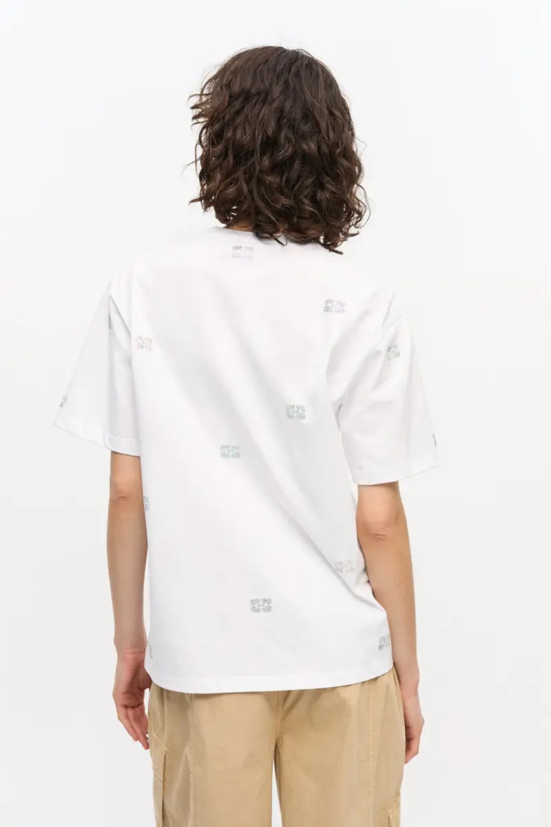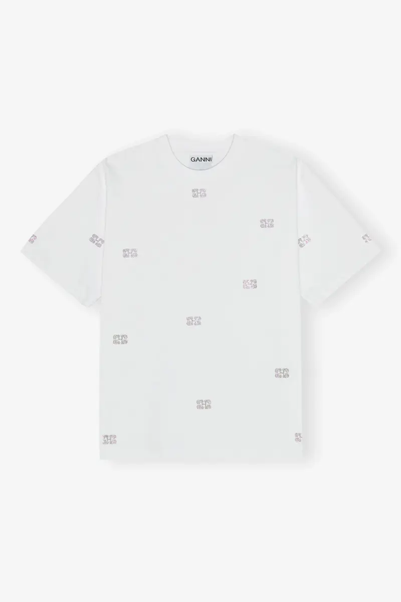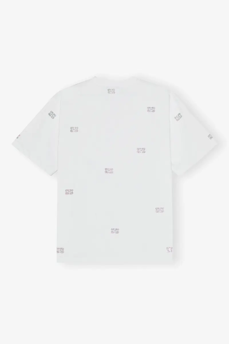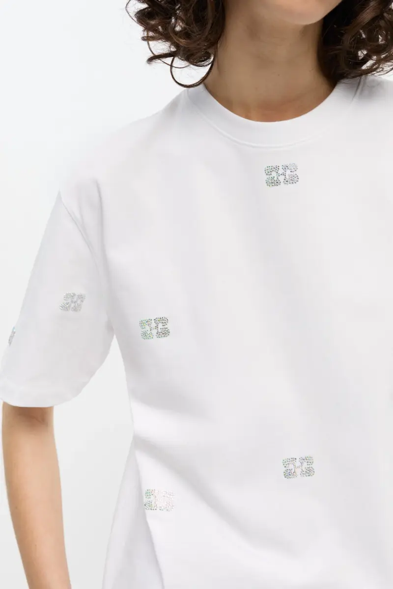 Dit witte T-shirt van zwaar katoen met strass heeft een ronde hals, korte mouwen en versierde GANNI-vlinderlogo’s.