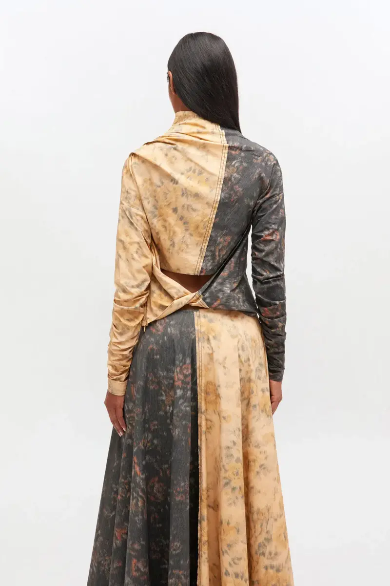 Deze top met romantische bloemenprint en split heeft een asymmetrische halslijn, ruches aan de mouwen en een gedraaide open rug.