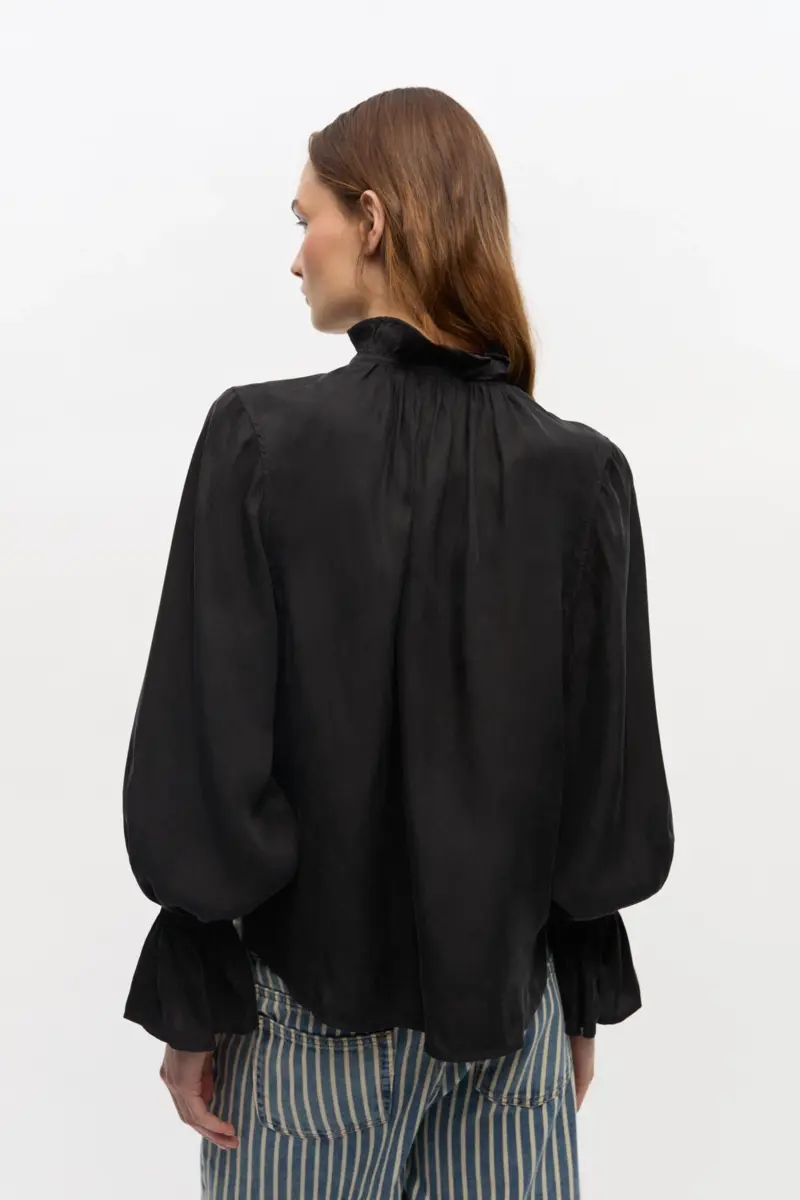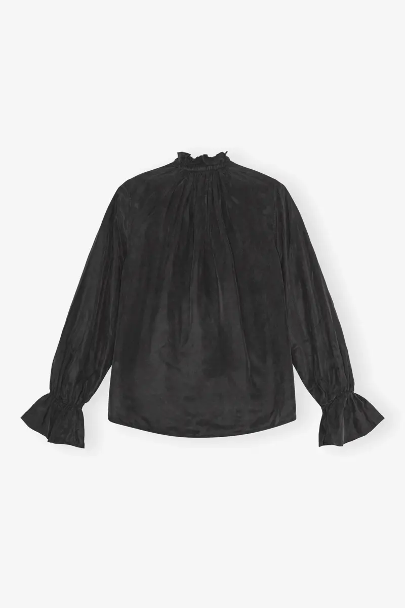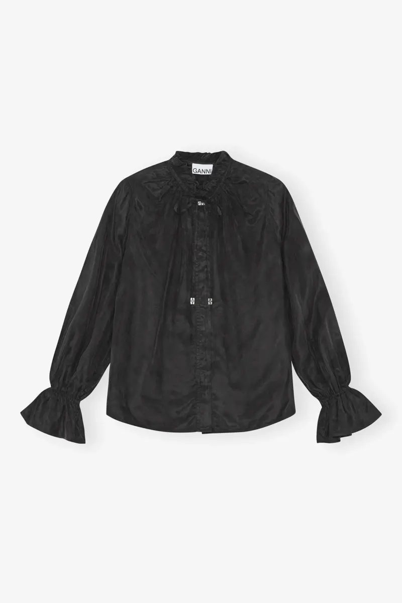 Dit shirt heeft een hoge halslijn en een strikband met zilverkleurige GANNI Butterfly-logodetails. Het shirt heeft volumineuze mouwen en details aan de manchetten.