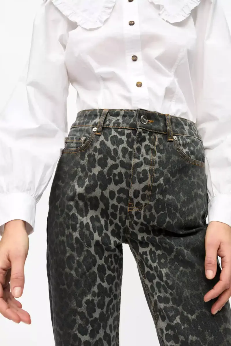 Deze jeans van grijs denim met luipaardprint heeft een ritssluiting met knoop, vijf zakken, riemlussen en een GANNI-logo op de achterzak.