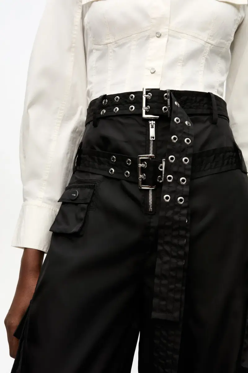 Deze broek heeft een zware zilveren ritssluiting, twee verstelbare, afneembare riemen in de taille, een voorzak en twee zijzakken.