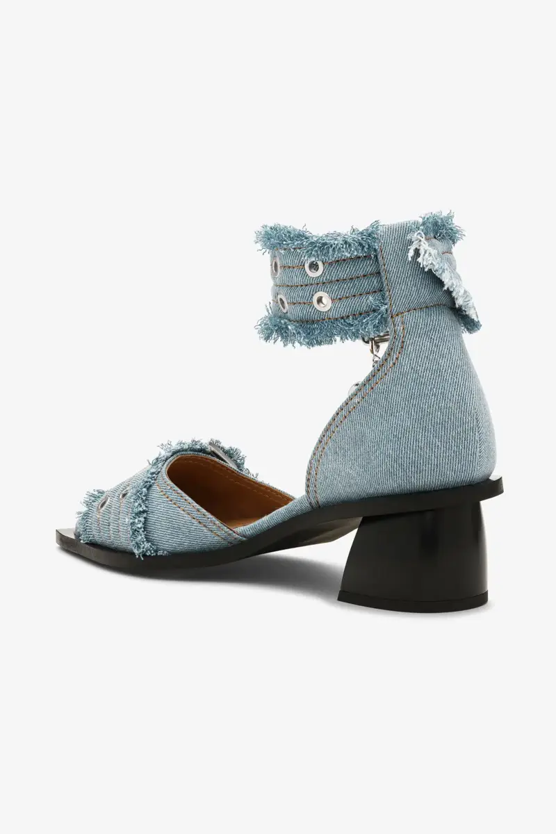 Vrouwelijke pumps met gesp en open teen in blauw denim