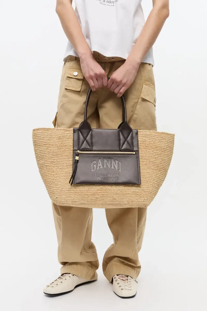 Deze draagtas heeft handvatten aan de bovenkant en een voorvak met een GANNI-logo in reliëf. Het vak heeft een ritssluiting en een treklipje met een goudkleurige metalen dobbelsteen. De buitenkant is gemaakt van