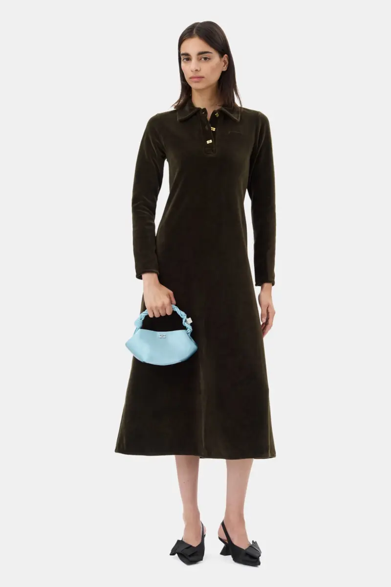 Deze tas heeft een ton sur ton metallic GANNI Butterfly-logo, een gedraaide handvat met een gevlochten knoop en een goudkleurige metallic dobbelsteen met een gegraveerd GANNI Butterfly-logo. De tas heeft een