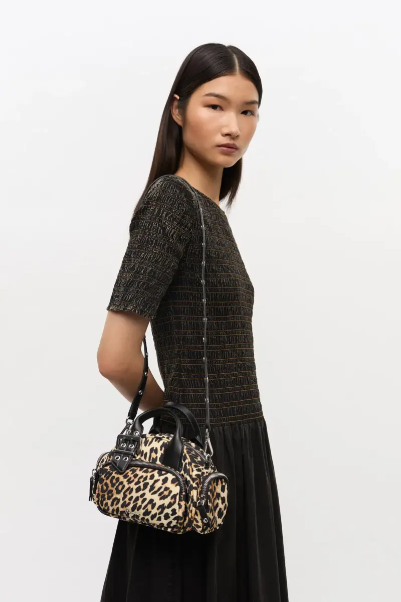 Deze tas heeft een handvat aan de bovenkant en een verstelbare schouderriem met metalen details. Hij heeft een ritssluiting, een voorvak, twee zijvakken en een zilverkleurig GANNI-logo.