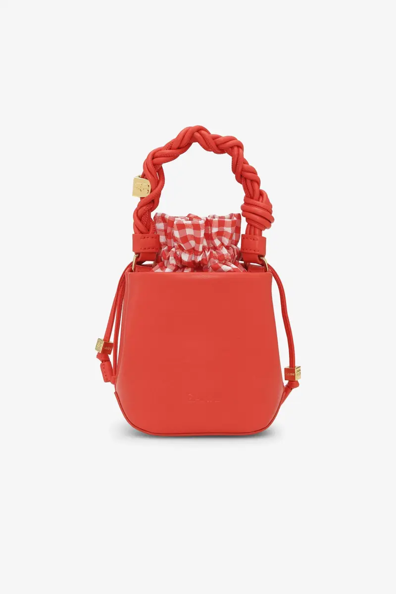 Deze tas heeft een gevlochten handvat met knoopdetail en een verstelbare en afneembare schouderriem. De tas heeft een zakje met trekkoord, een logo in reliëf op de achterkant en een plat binnenvak.