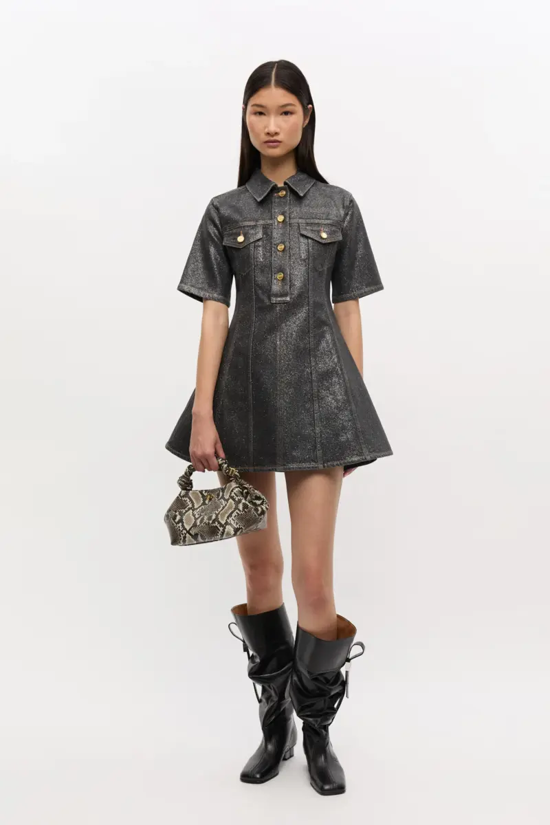 Deze tas heeft een ton sur ton metallic GANNI Butterfly-logo, een gedraaide handvat met een gevlochten knoop en een goudkleurige metallic dobbelsteen met een gegraveerd GANNI Butterfly-logo. De tas heeft een