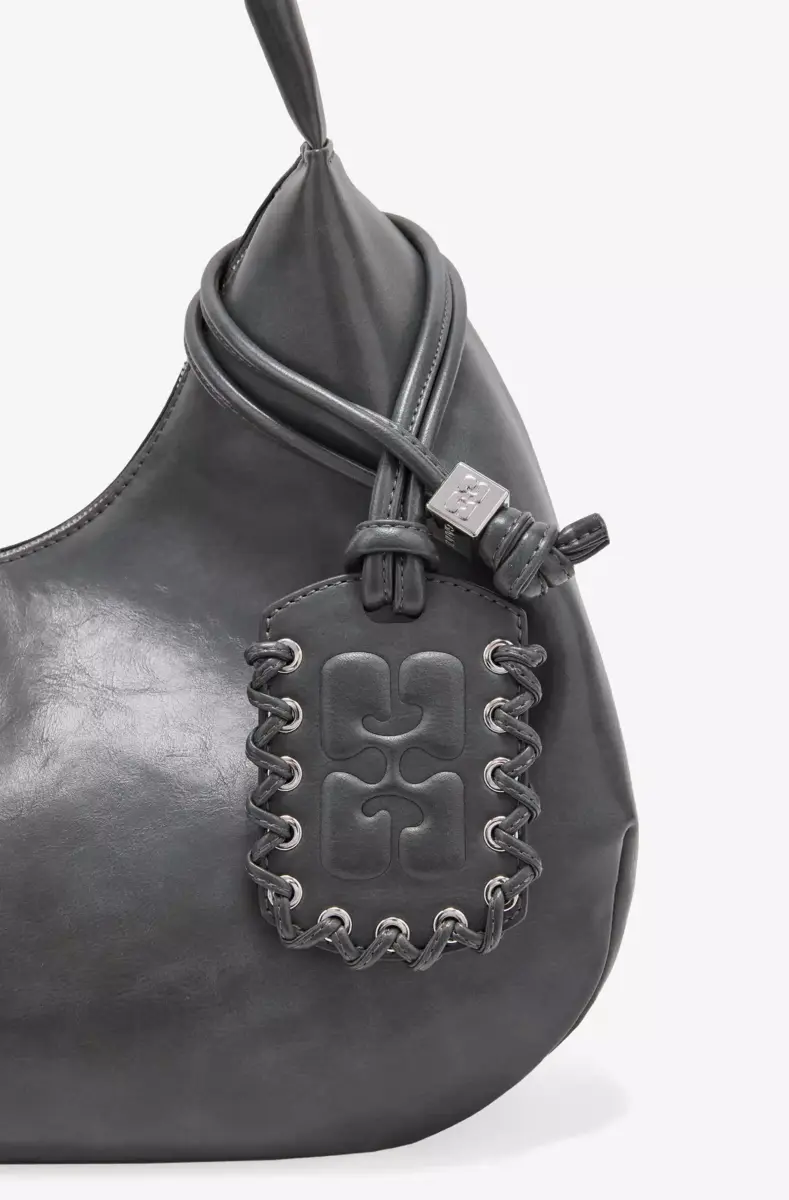Deze tas heeft een zachte en soepele afwerking, een enkele schouderriem en een ritssluiting. De tas heeft zilverkleurige hardware, een GANNI Butterfly-logo en een spiegelhangertje.