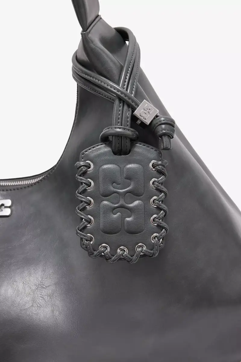 De tas is vervaardigd uit gerecycled leer met een spiegelend hanglabel en logo-hardware.