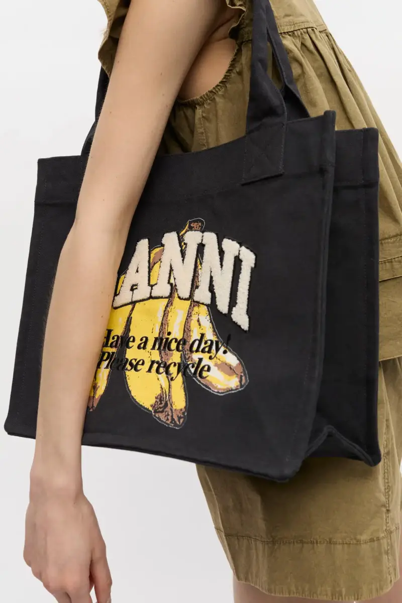 Deze draagtas heeft handvatten aan de bovenkant, één groot vak en een GANNI-logo met de tekst ‘Have a nice day! Please recycle’.
